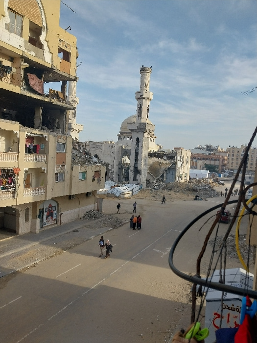 This image depicts a street scene in Khan Yunis, Palestinian Territory, characterized by extensive structural damage under a partly cloudy sky. In the background, a severely damaged mosque stands prom…read more