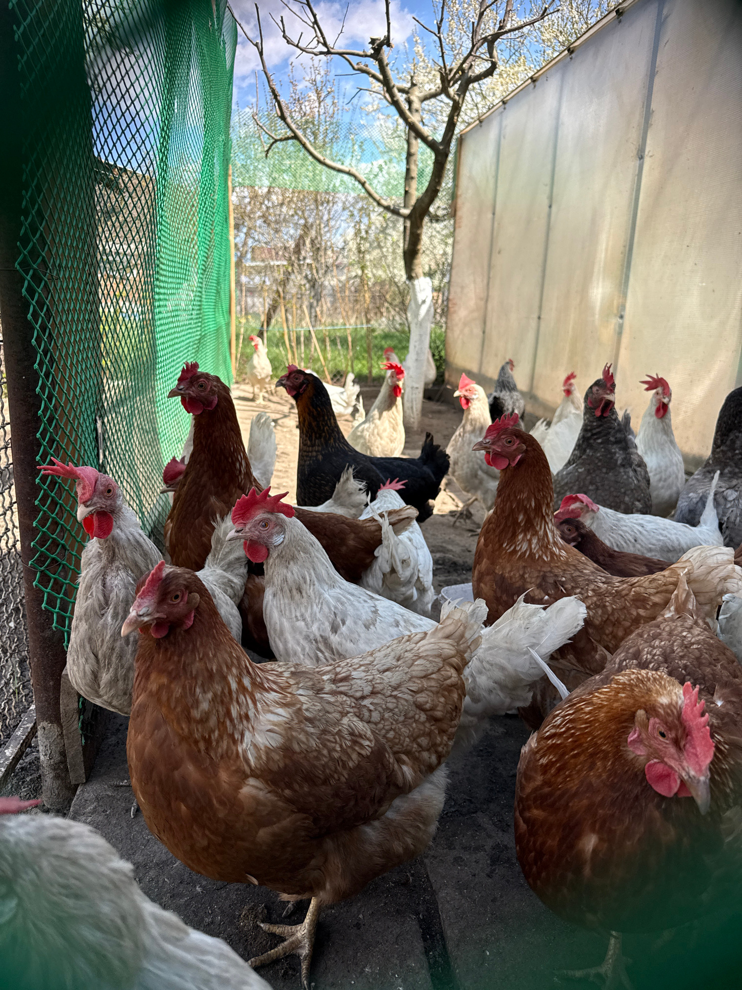 The image shows a flock of chickens in an enclosure, seemingly in Razlog, Bulgaria. Several chickens of different breeds (brown, white, grey, and black) are clustered together, with some near the greeβ¦read more