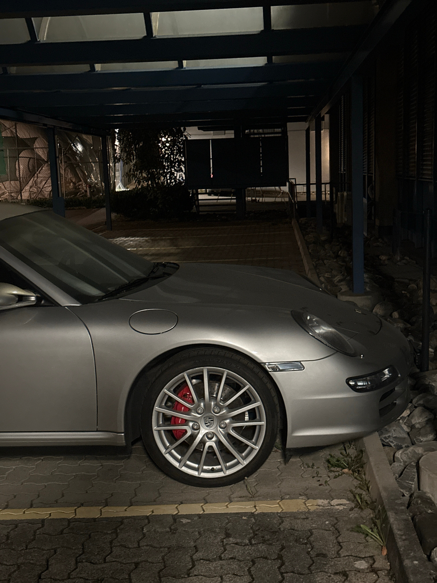 A silver Porsche is parked on a paved area with a brick-like pattern in what appears to be a confined space next to a wall or ledge with some vegetation. The car is partially obscured by the low light…read more