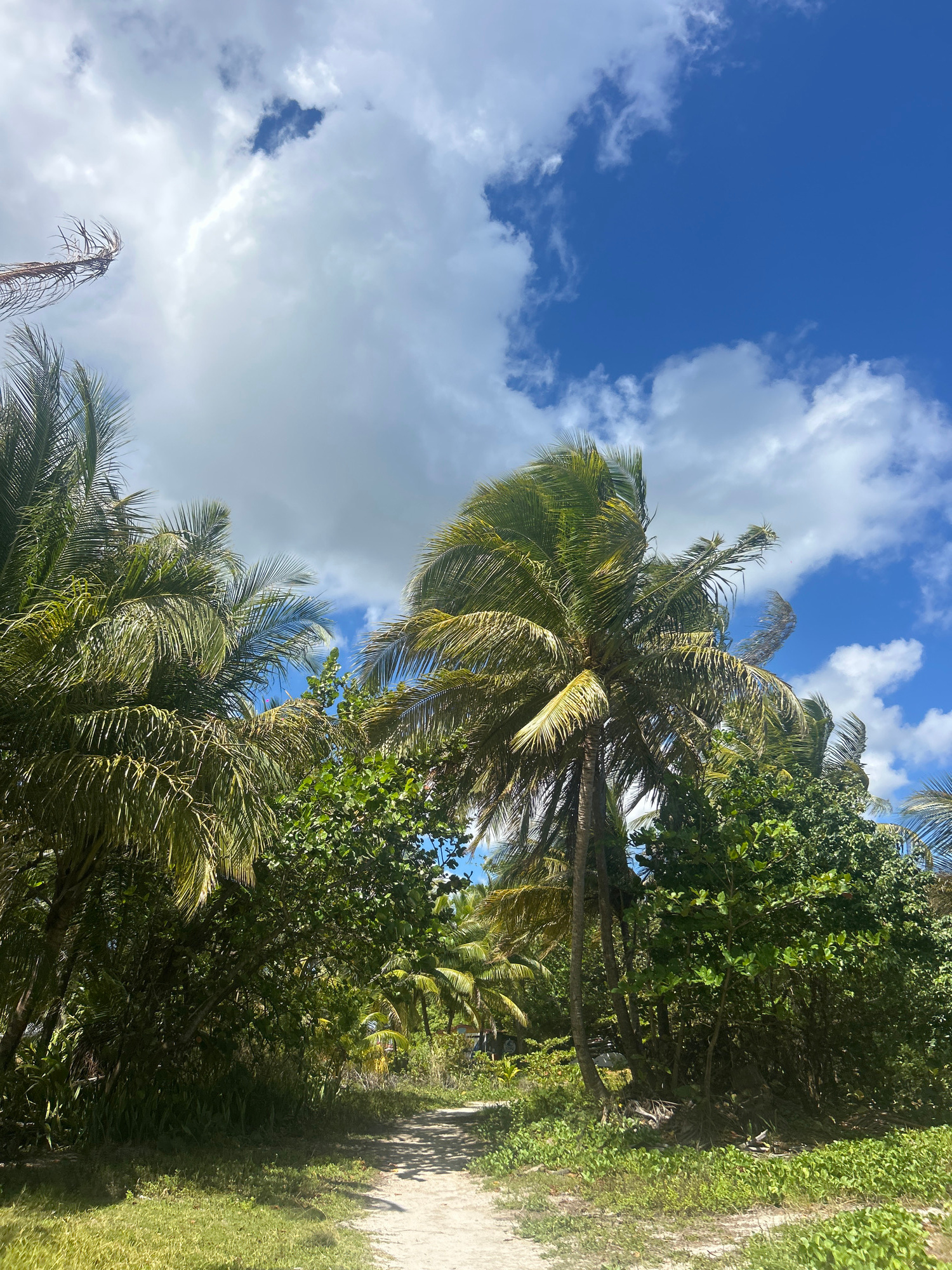 The image shows a view of palm trees and other lush greenery under a partially cloudy sky, with the ground and a narrow path visible on the right. The location is likely Sainte-Anne, France based on t…read more