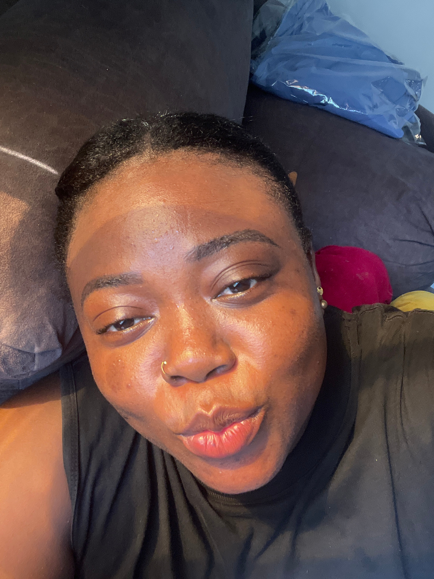 A close-up, downward-facing image shows a person lying on a dark, possibly gray, cushioned surface. The person has dark skin, dark hair, and what appears to be a nose ring. The individual is wearing a…read more