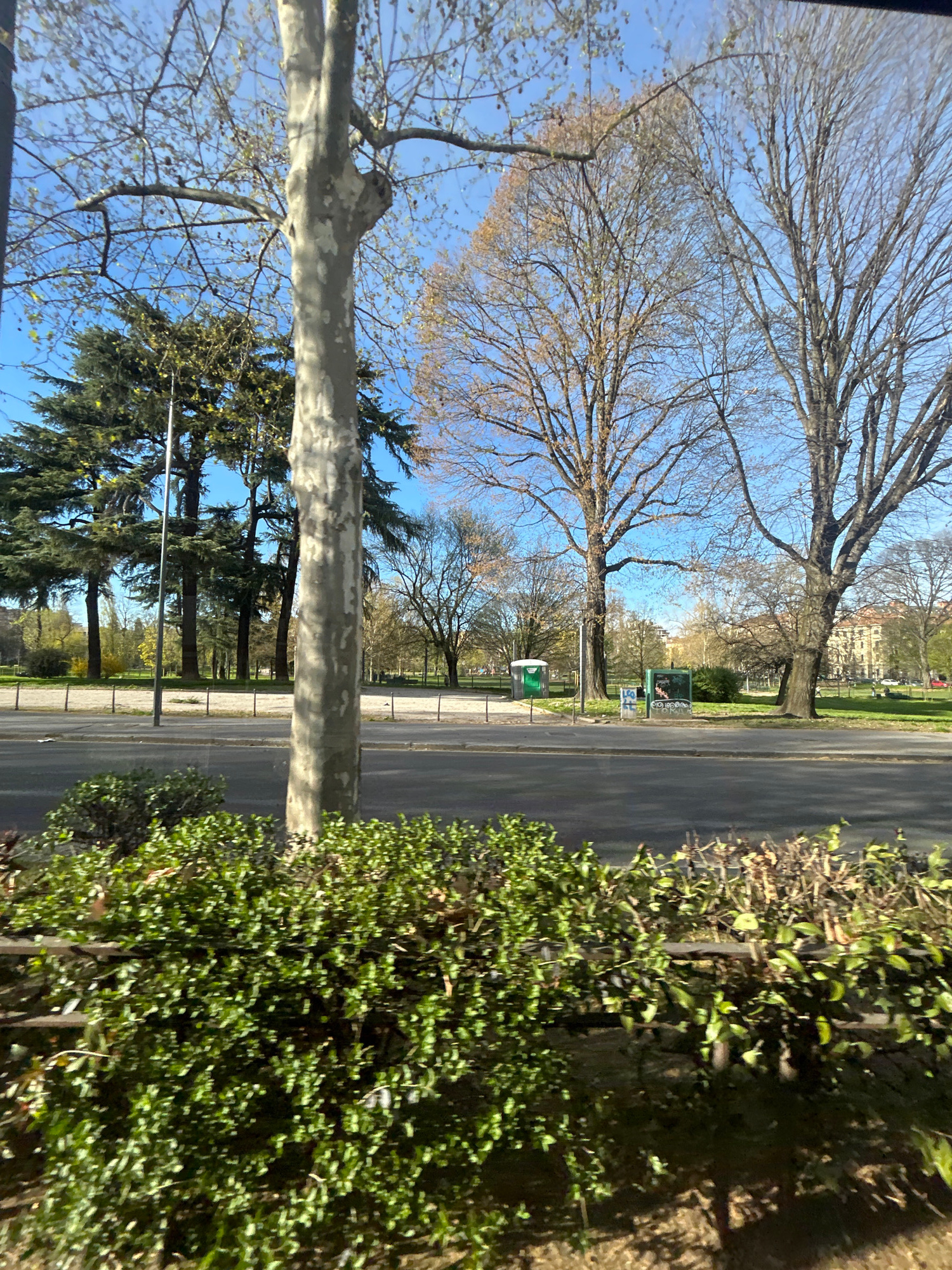 The scene depicts an outdoor urban park environment in Milan, Italy, specifically an area bordering the Giardini Pubblici Indro Montanelli, viewed across a city street. The perspective is from a sligh…read more