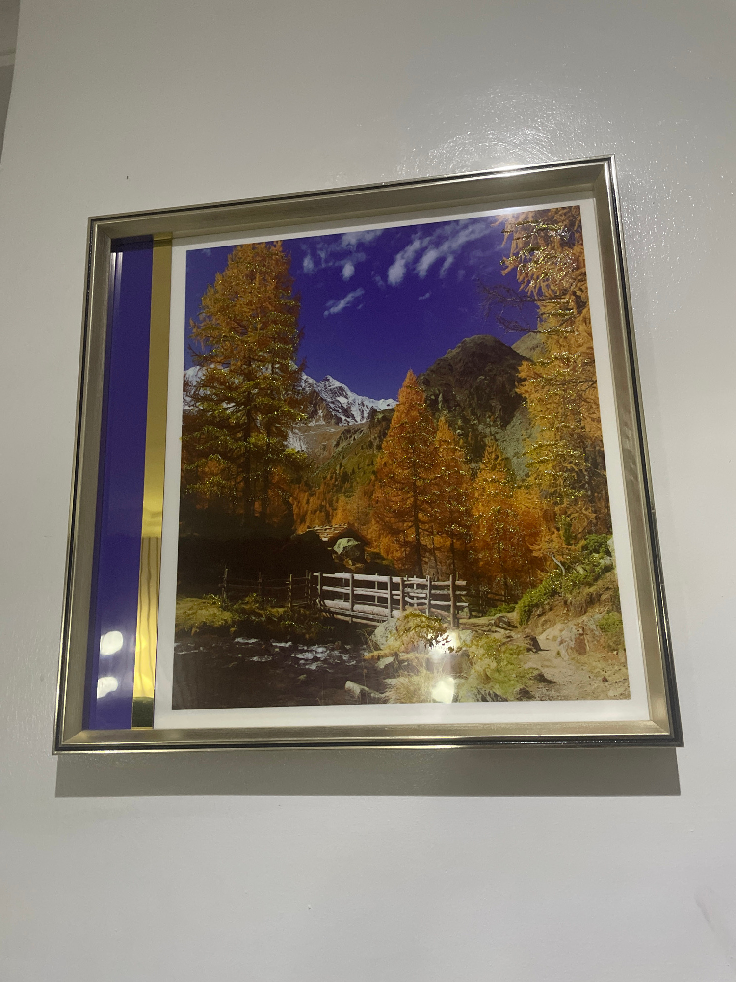 A framed print hangs on a white wall. The print depicts a mountain landscape in autumn with a blue sky. The print has a gold and blue border. The frame is silver. The location is unknown, and there ar…read more