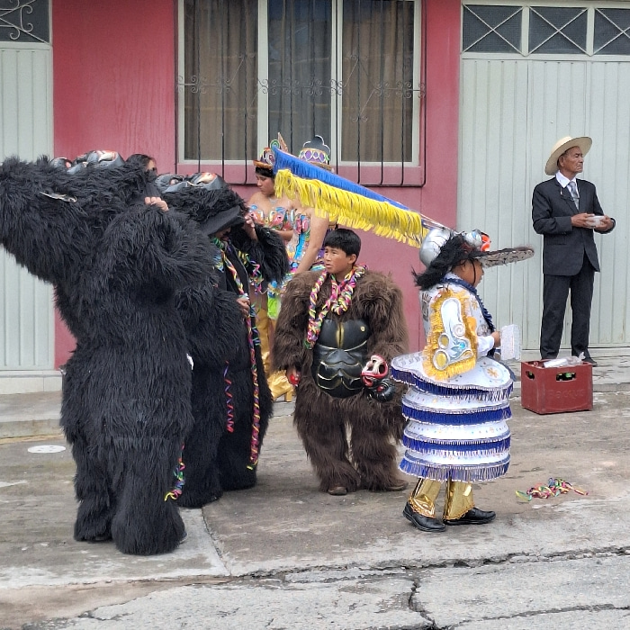 The image displays an outdoor scene, likely a public street or plaza, filled with people in elaborate costumes, suggesting a cultural parade, festival, or performance. The setting appears to be daytim…read more