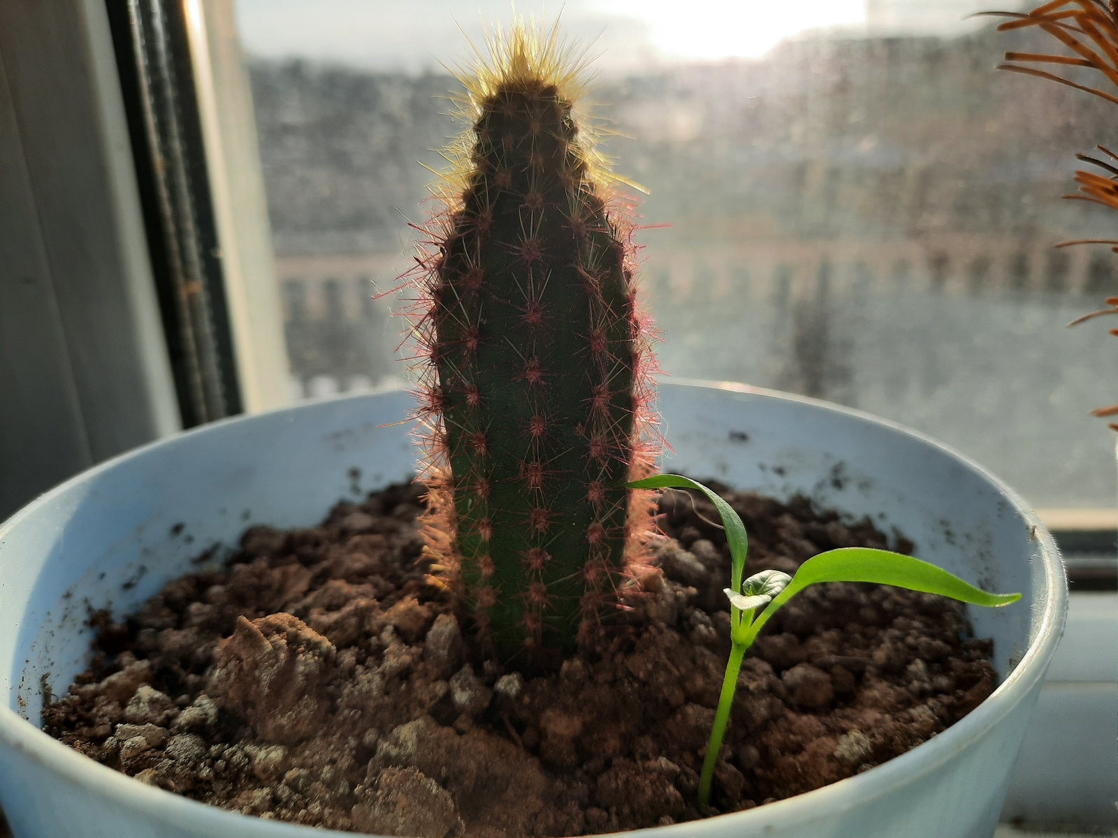 A medium shot captures a cactus in a light blue pot, positioned on what appears to be a windowsill. The pot is filled with dark brown soil. Next to the cactus, a small green plant with two leaves is s…read more