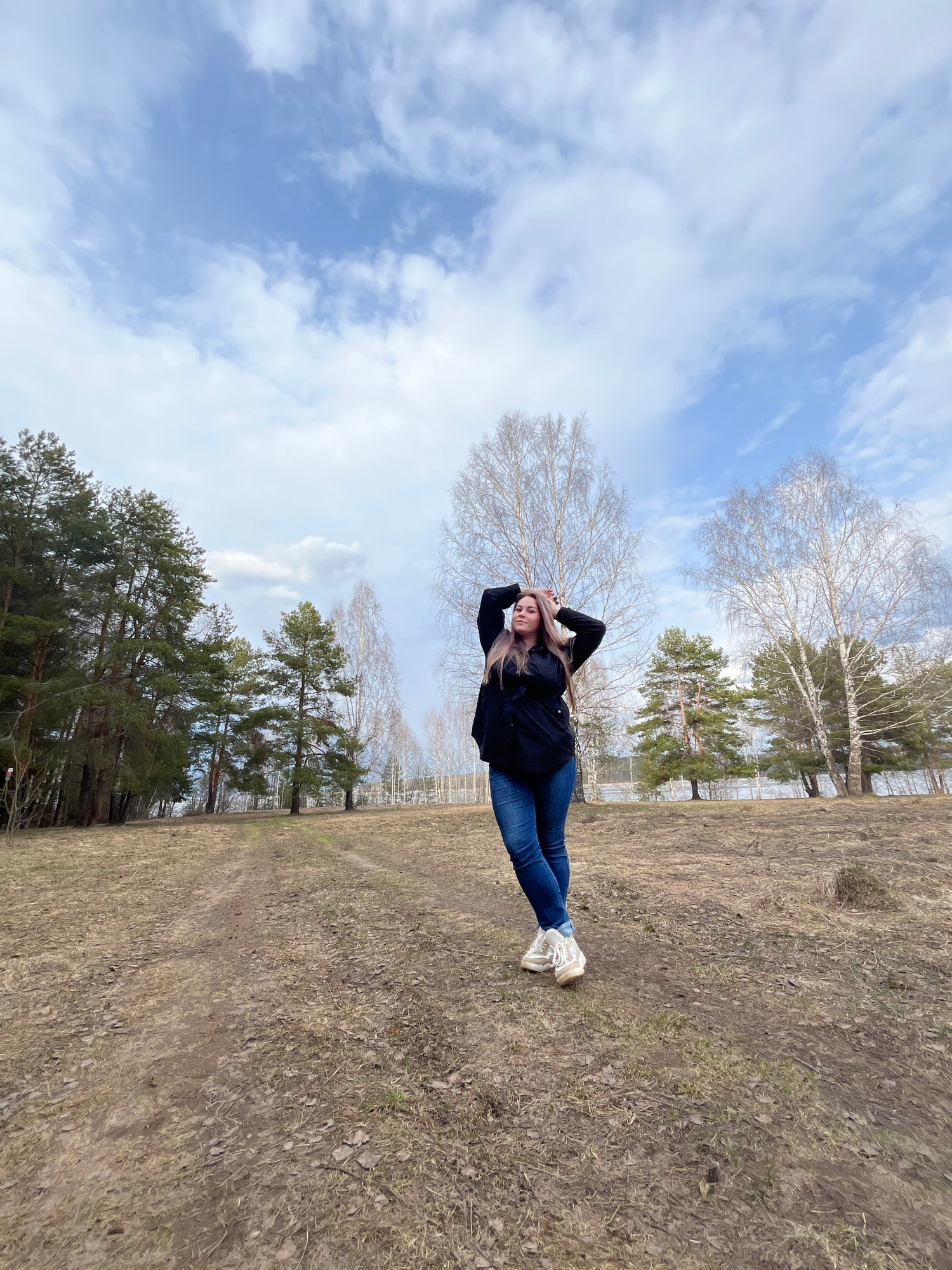 The image shows a woman lying in a field with trees and a sky with clouds in the background. The woman is wearing jeans, a black jacket, and white sneakers. She has her hands behind her head. The fiel…read more