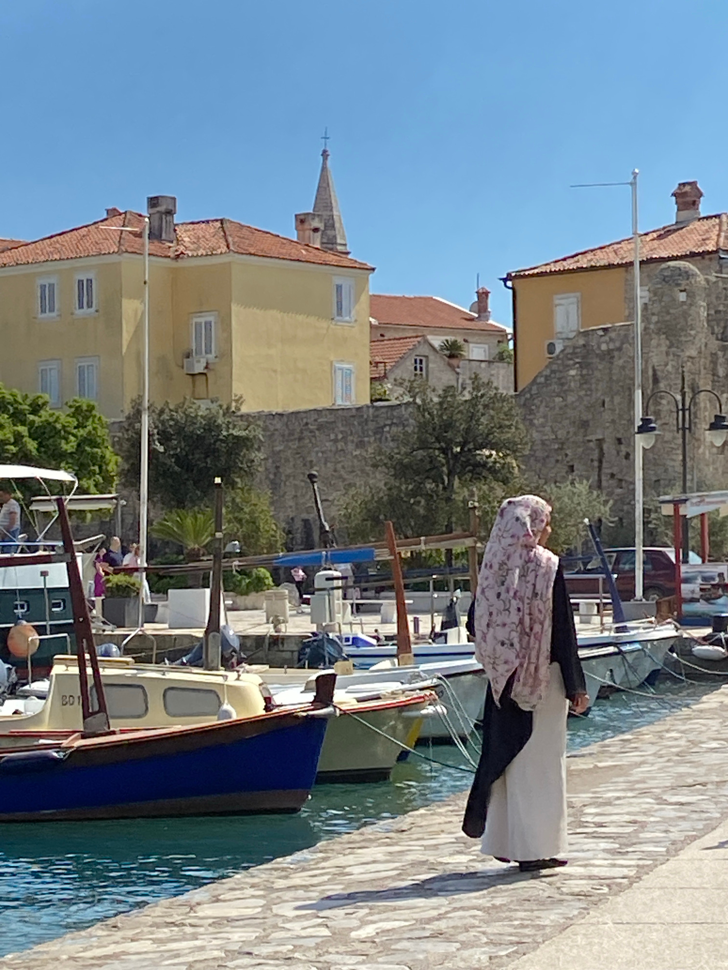 The image shows a waterfront scene in the city of Budva, Montenegro. A row of buildings with yellow facades and red-tiled roofs is visible. One building has a church spire rising above it. Several boa…read more