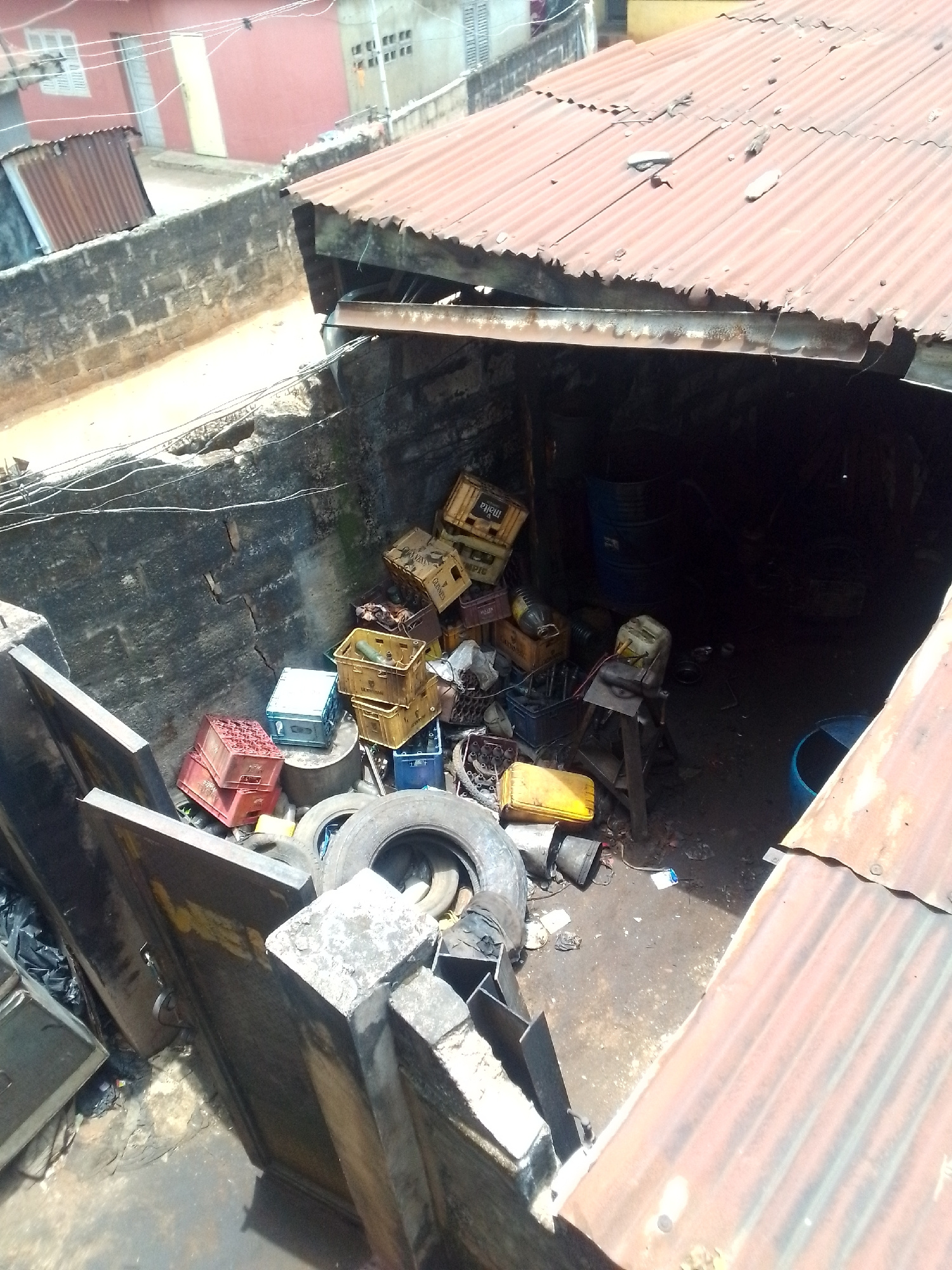 The image depicts a cluttered, outdoor workspace in an urban setting, likely in Unknown, Unknown. The area is enclosed by weathered concrete walls and covered by a corrugated metal roof. Various objec…read more