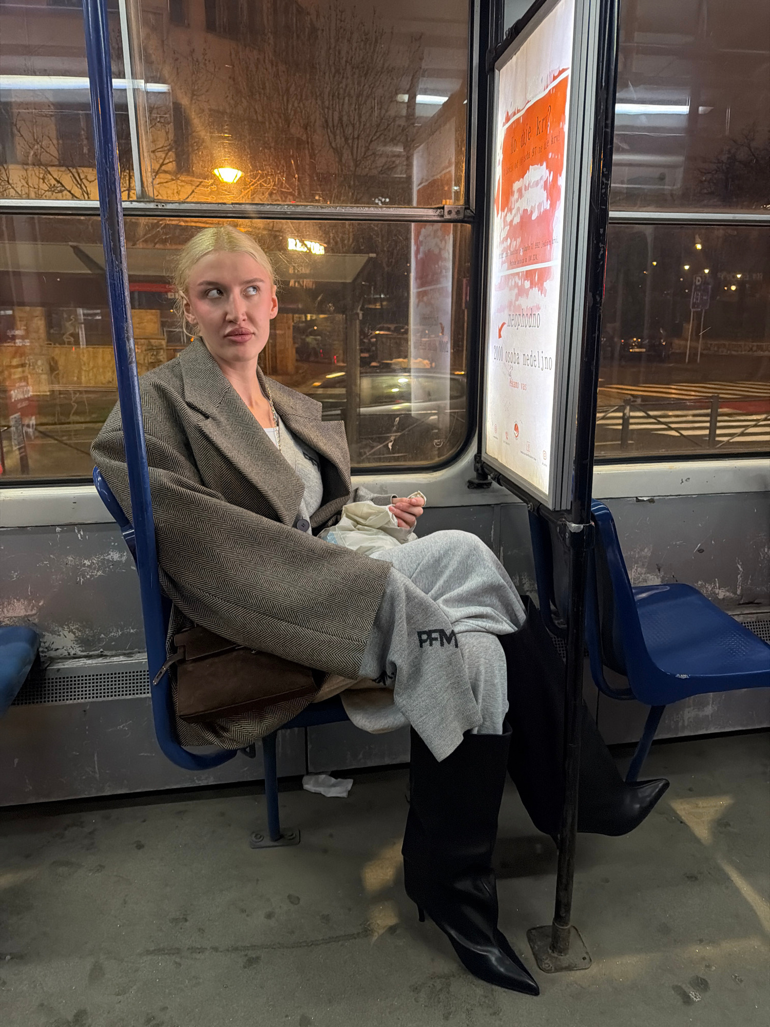 The image depicts the interior of a public transport vehicle, likely a tram, at night in Belgrade, Serbia. A blonde-haired adult female is seated on a blue plastic bucket seat on the left. She wears a…read more