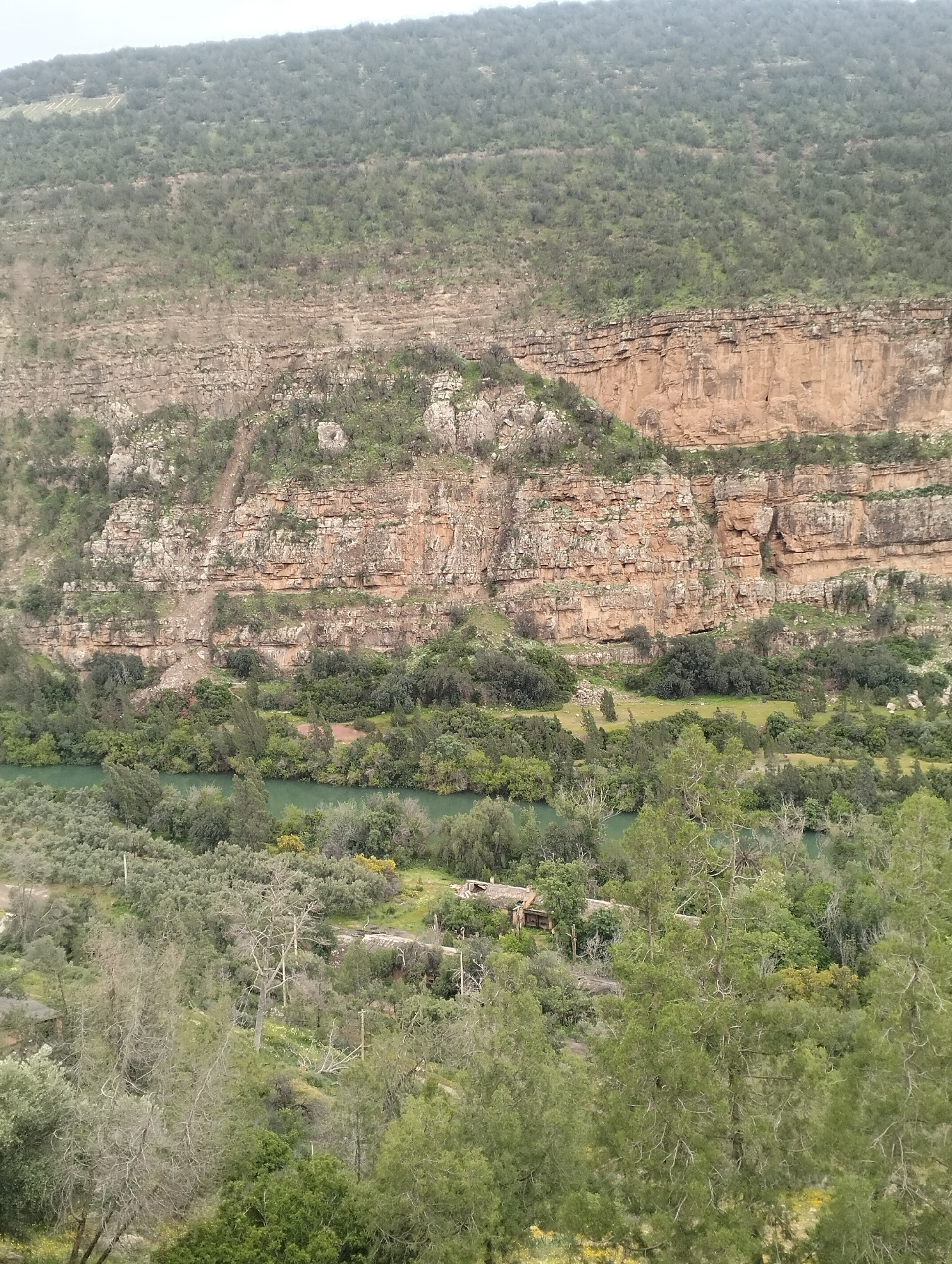 The image shows a view of a river flowing through a valley in Bin El Ouidane, Morocco. In the background is a large cliff with layered rock formations, covered with vegetation. The river is greenish a…read more
