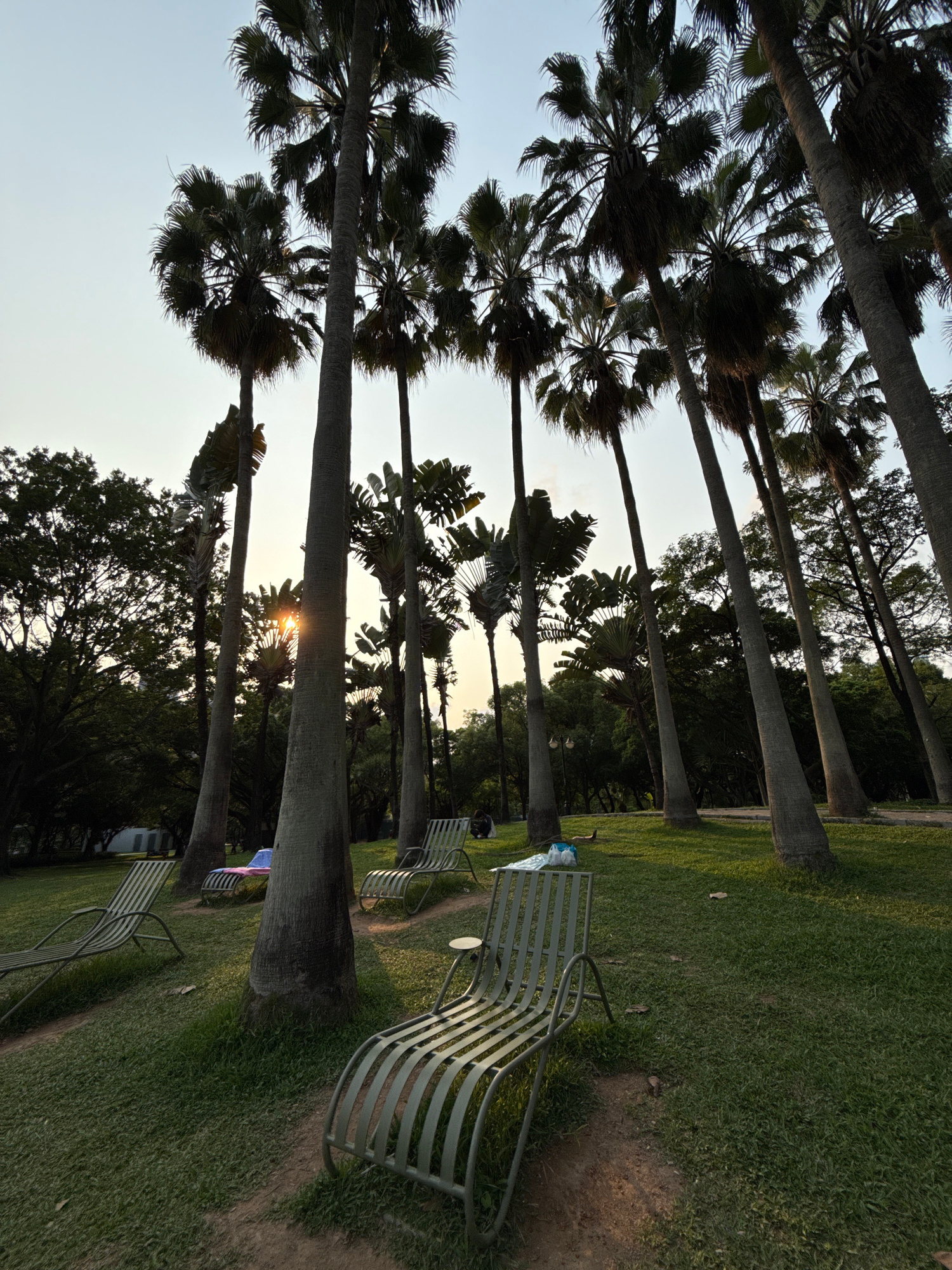 The image depicts a park setting in Futian District, China, identified by the presence of royal palm trees (Roystonea regia), a characteristic feature of the area. The scene is captured from a low ang…read more