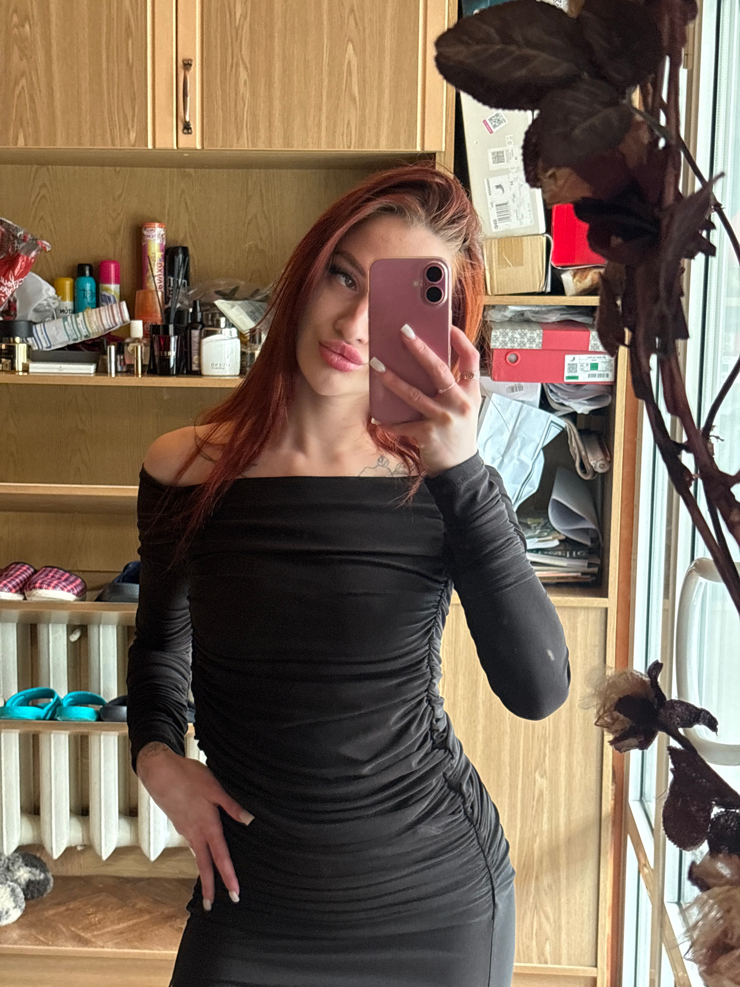 A woman is taking a selfie in a mirror. She has long red hair, is wearing a black dress, and is holding a pink cell phone. The mirror reflects a room with wooden cabinets, a radiator, and various item…read more