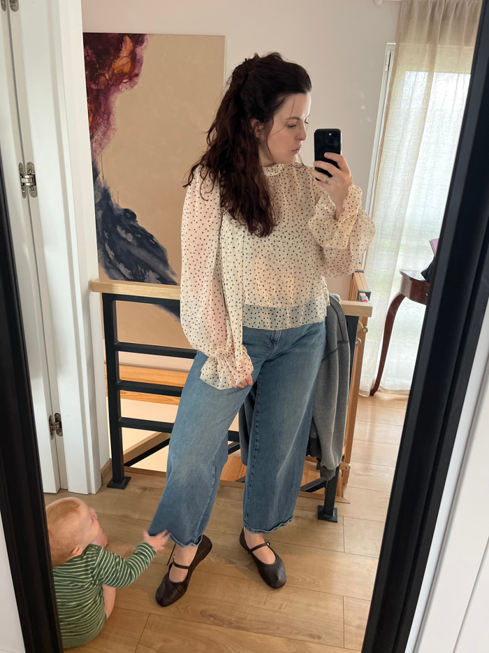 The image depicts an indoor scene in Gangloff, Germany, captured as a mirror selfie. An adult female stands centrally, facing left, holding a dark-colored smartphone in her right hand, positioned to p…read more
