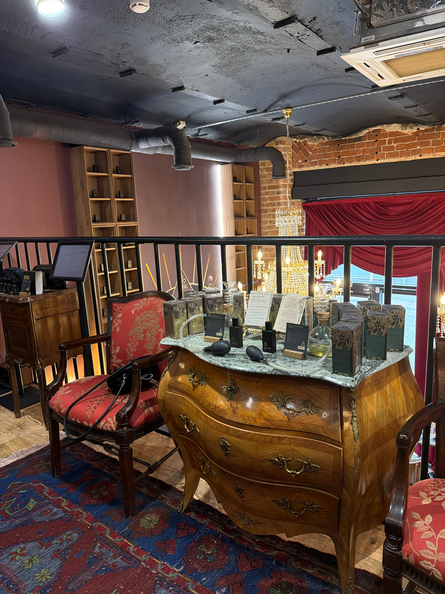 The image depicts an interior space, possibly a shop or a boutique, in what may be Moscow, Russia, given the architectural and decorative elements. The foreground features an ornate wooden chest or d…read more