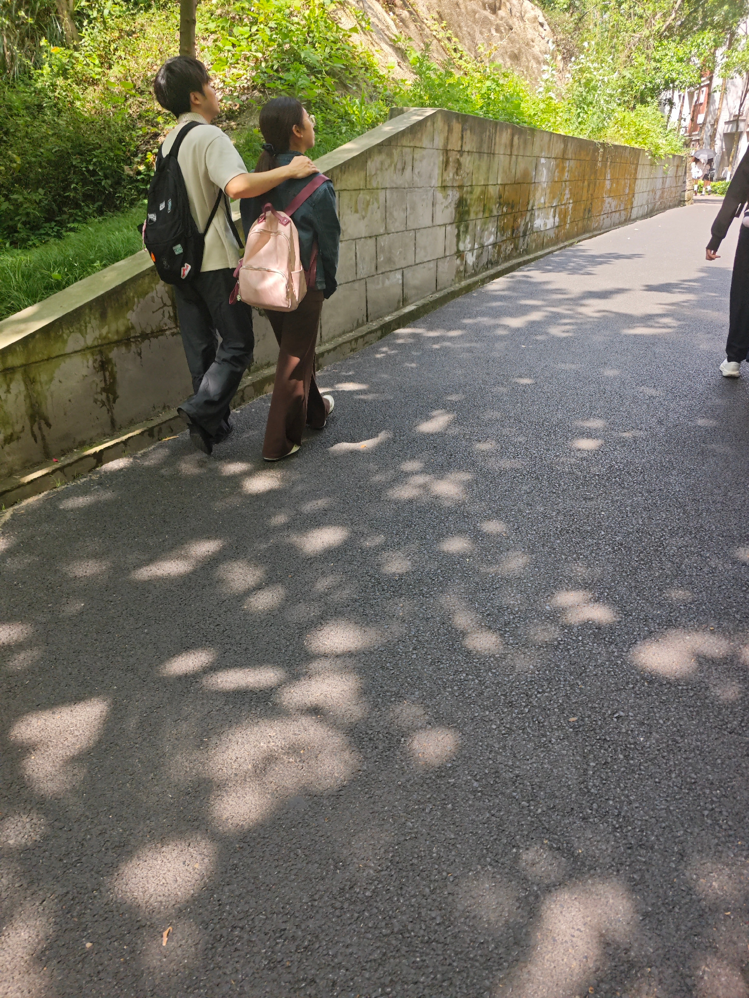 The image depicts two young individuals walking along an asphalt path on a sunny day in what appears to be an outdoor, possibly park-like setting within the Chongqing High-tech Zone, China. The main…read more