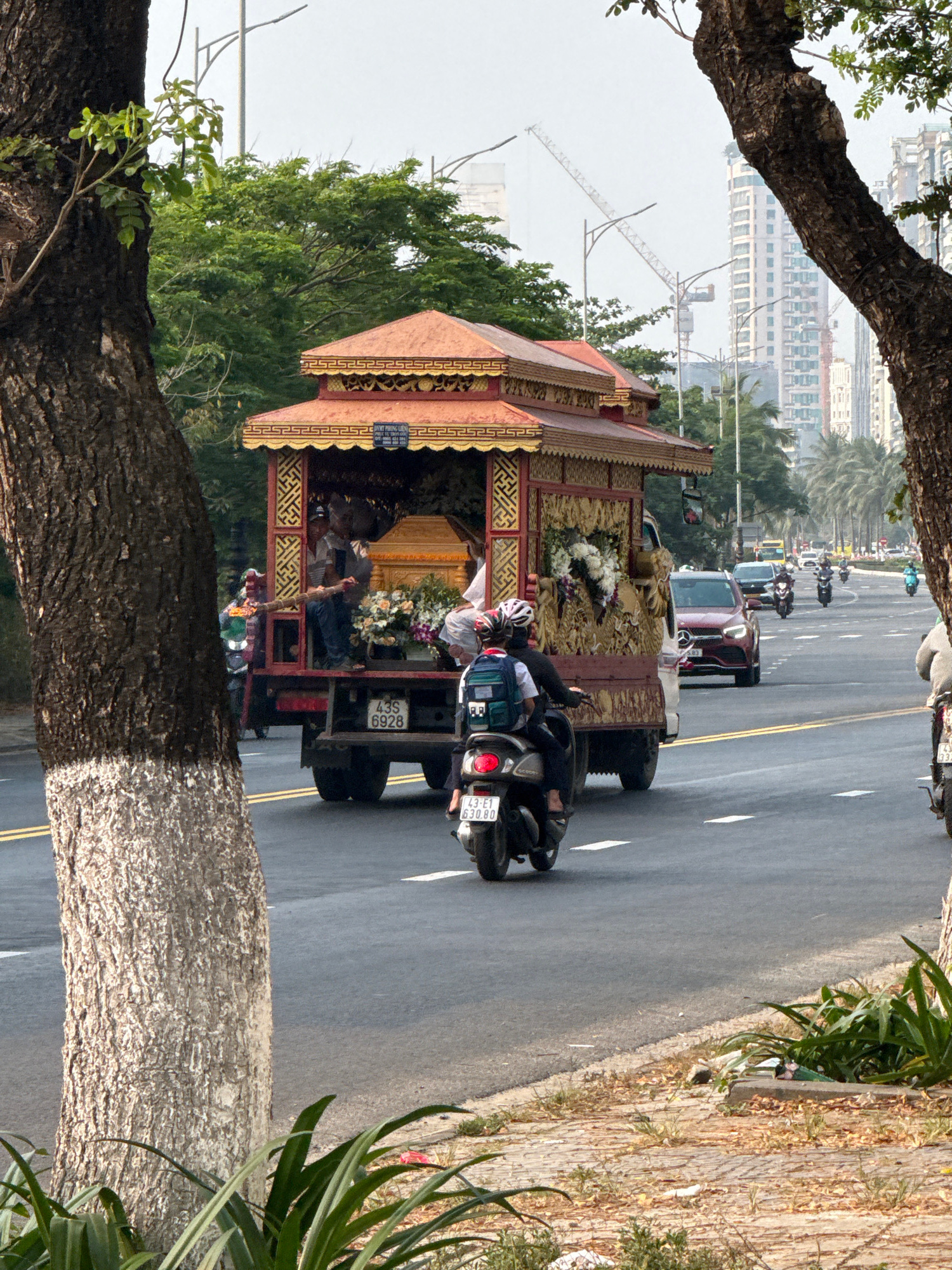 A slow-moving procession travels along a coastal road in Đà Nẵng, Vietnam. The scene is framed by trees on either side of the road. The focal point is an elaborate, ornately decorated structure mounte…read more