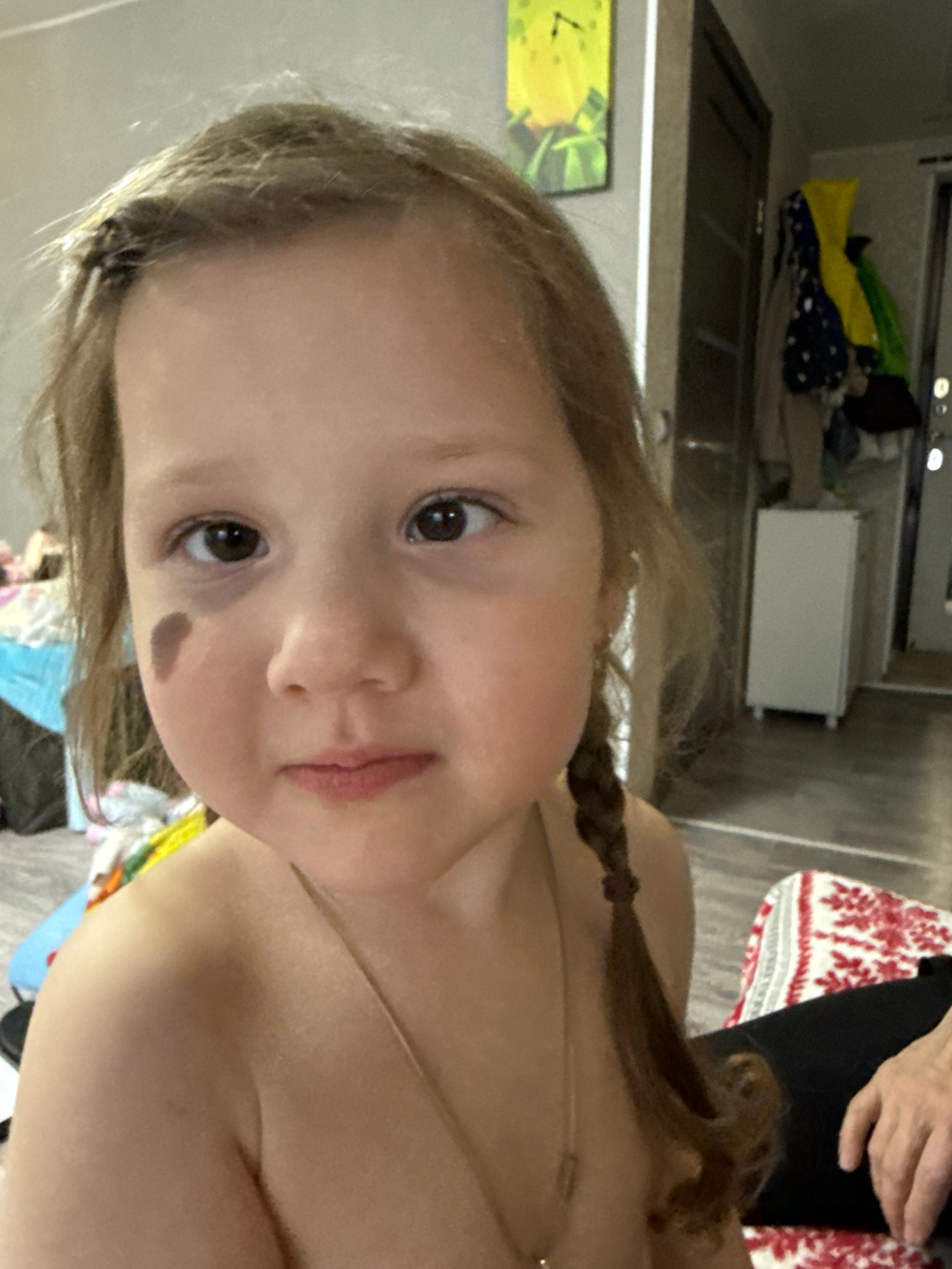 A close-up shot depicts a young girl with light brown hair, styled with a small braid. She has fair skin and brown eyes, and a small mole is visible on her left cheek. She appears to be wearing a thin…read more