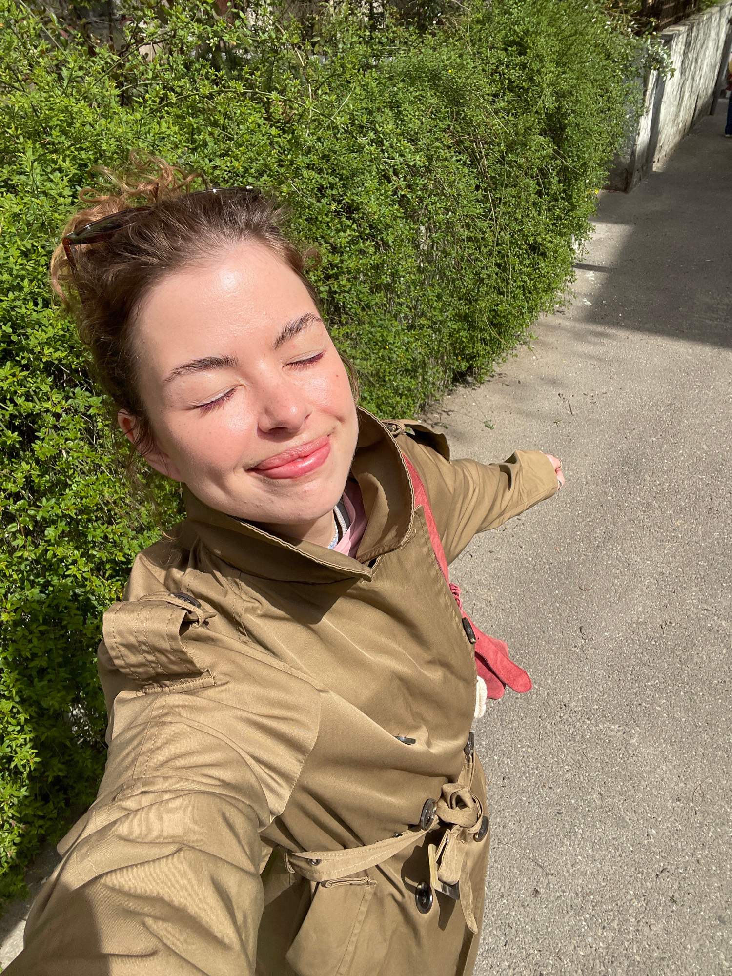 A young woman with closed eyes and a slight smile poses for a selfie outdoors, tilted to the left. She wears a tan trench coat over a pink top, and her hair is pulled back, revealing sunglasses tucked…read more