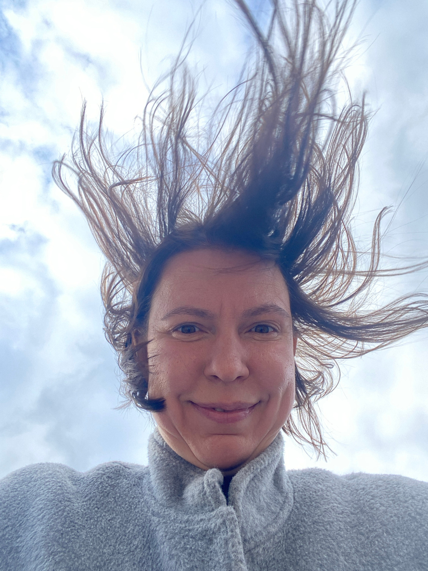 The image presents a close-up, low-angle portrait of a person against a cloudy sky in Chaikovsky, Russia. The main subject is a person's head, with their dark brown hair appearing dynamically splayed…read more