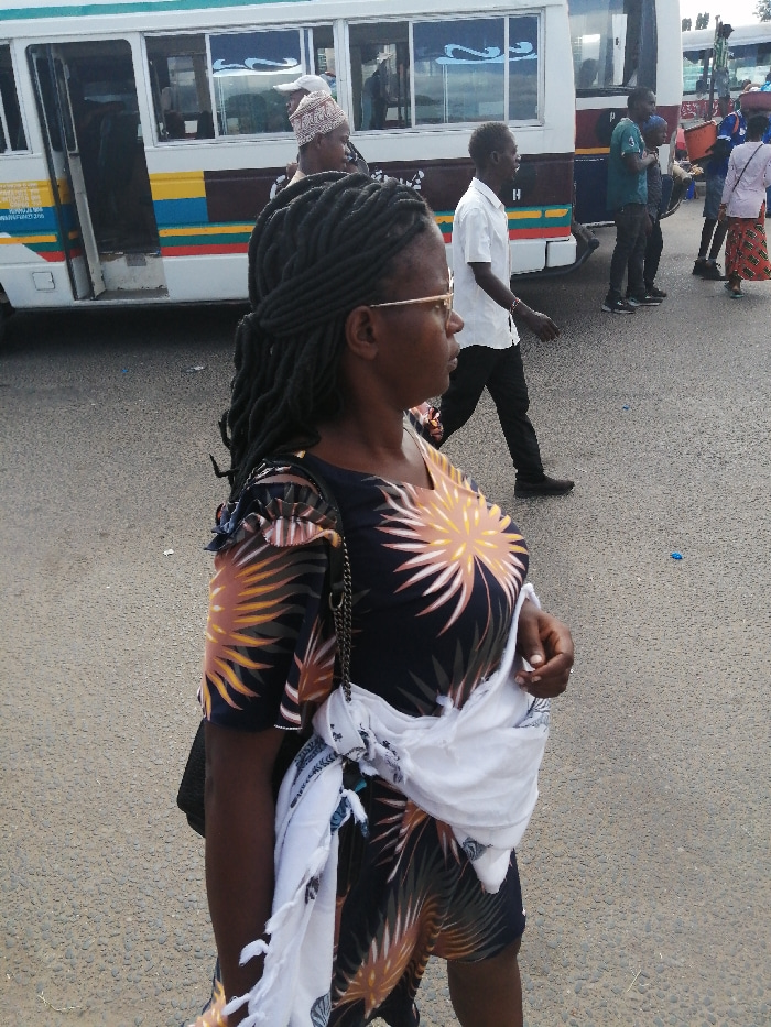 A woman with braided hair and glasses stands in the foreground. She wears a patterned dress and has a white scarf draped over her shoulder. Behind her, a bus with people boarding is visible, along wit…read more
