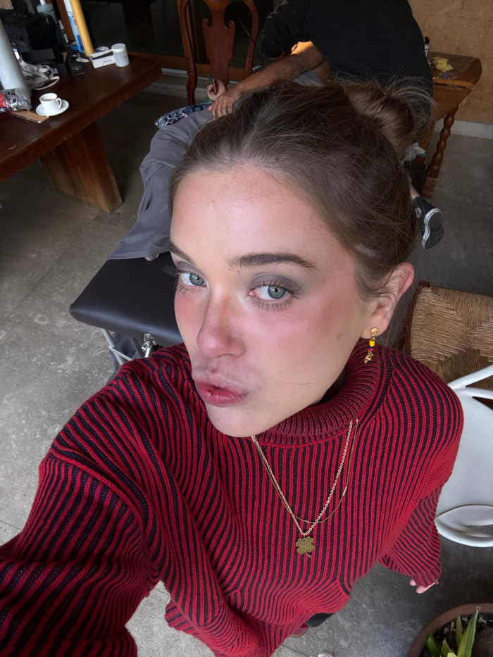 A woman looks up at the camera, her head tilted slightly. She has fair skin, light brown hair in a bun, and blue eyes. She wears a red and black striped turtleneck sweater and a gold necklace with a cā¦read more