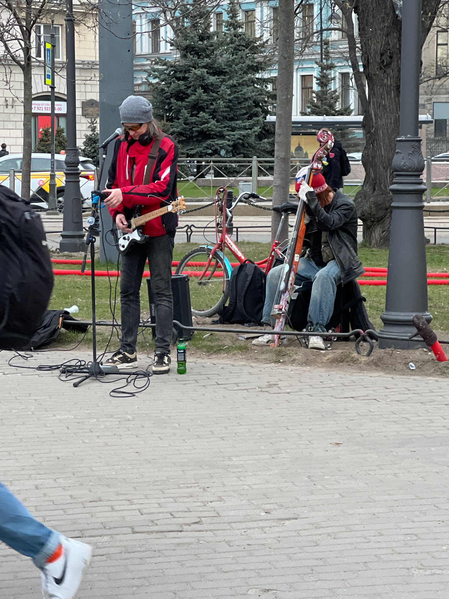 The image captures a scene in Saint Petersburg, Russia, featuring two street musicians performing outdoors. One musician plays an electric guitar and sings into a microphone while wearing a red jacketโ€ฆread more