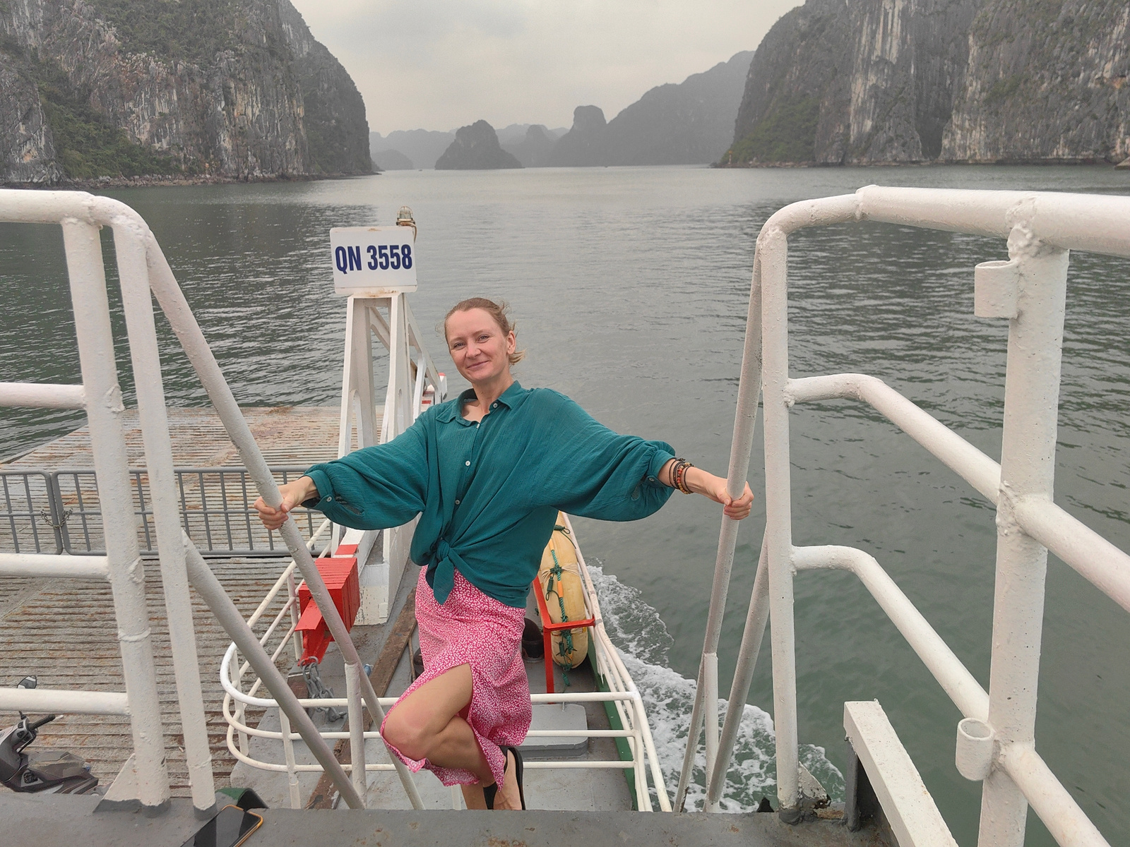 A woman is standing on the deck of a boat in Bai Chay Ward, Vietnam. The boat is surrounded by water and limestone karsts. The woman is wearing a green shirt and a pink skirt. She is holding onto the…read more