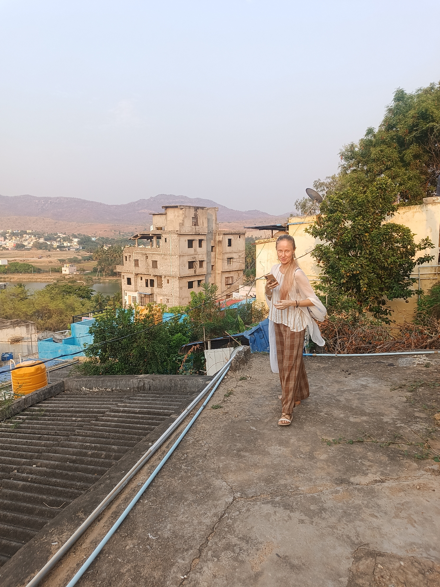 A Caucasian female walks on a concrete rooftop in Puttaparthi, India, holding a smartphone. She wears a light-colored, striped top, brown plaid pants, and sandals. Behind her is a multi-story, unfinis…read more