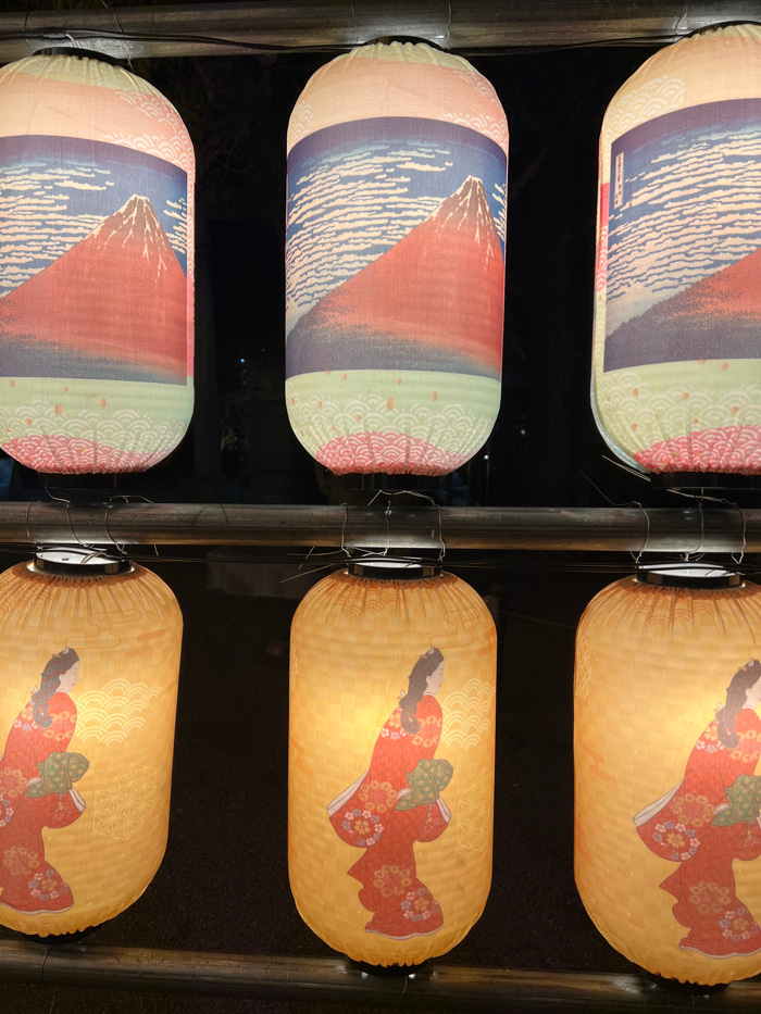 Six illuminated cylindrical Japanese lanterns are displayed in two horizontal rows against a dark, out-of-focus background in Taito, Japan. The upper row consists of three lanterns, each depicting a s…read more