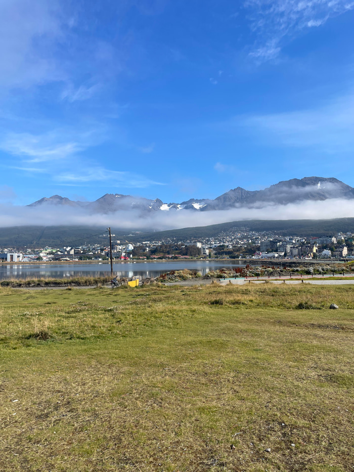 This image presents a panoramic daytime view of Ushuaia, Argentina. The foreground consists of an expansive, unkempt grassy field exhibiting varying shades of green and brown, with no discernible indi…read more