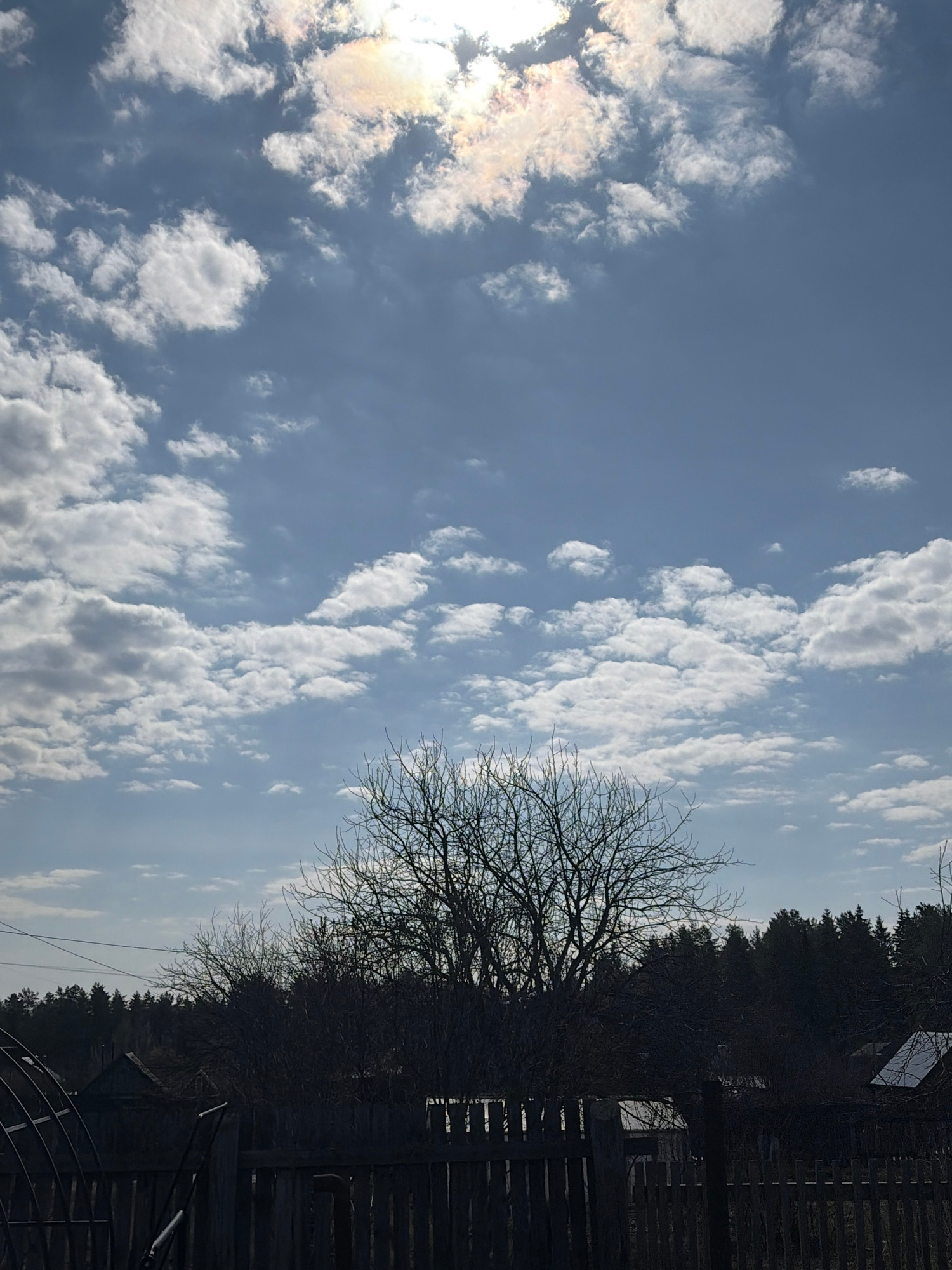 The image displays an outdoor scene, presented in a portrait orientation but rotated 90 degrees clockwise. The upper two-thirds of the frame are filled with a bright blue sky dotted with numerous scat…read more