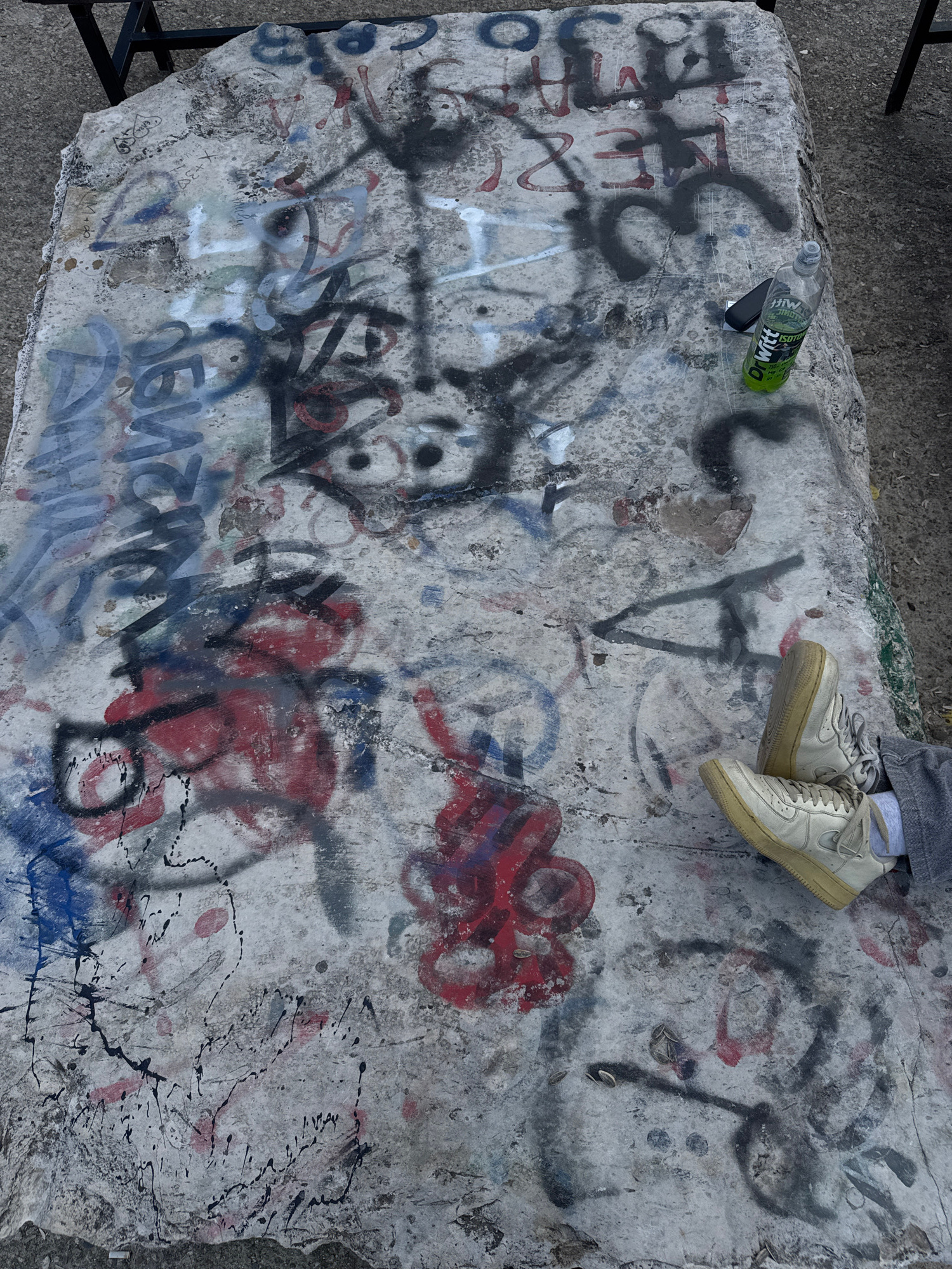 A high-angle shot displays a weathered concrete slab, likely part of urban infrastructure, possibly in Gotse Delchev, Bulgaria. Graffiti in red, blue, and black covers the surface. A pair of tan sneak…read more