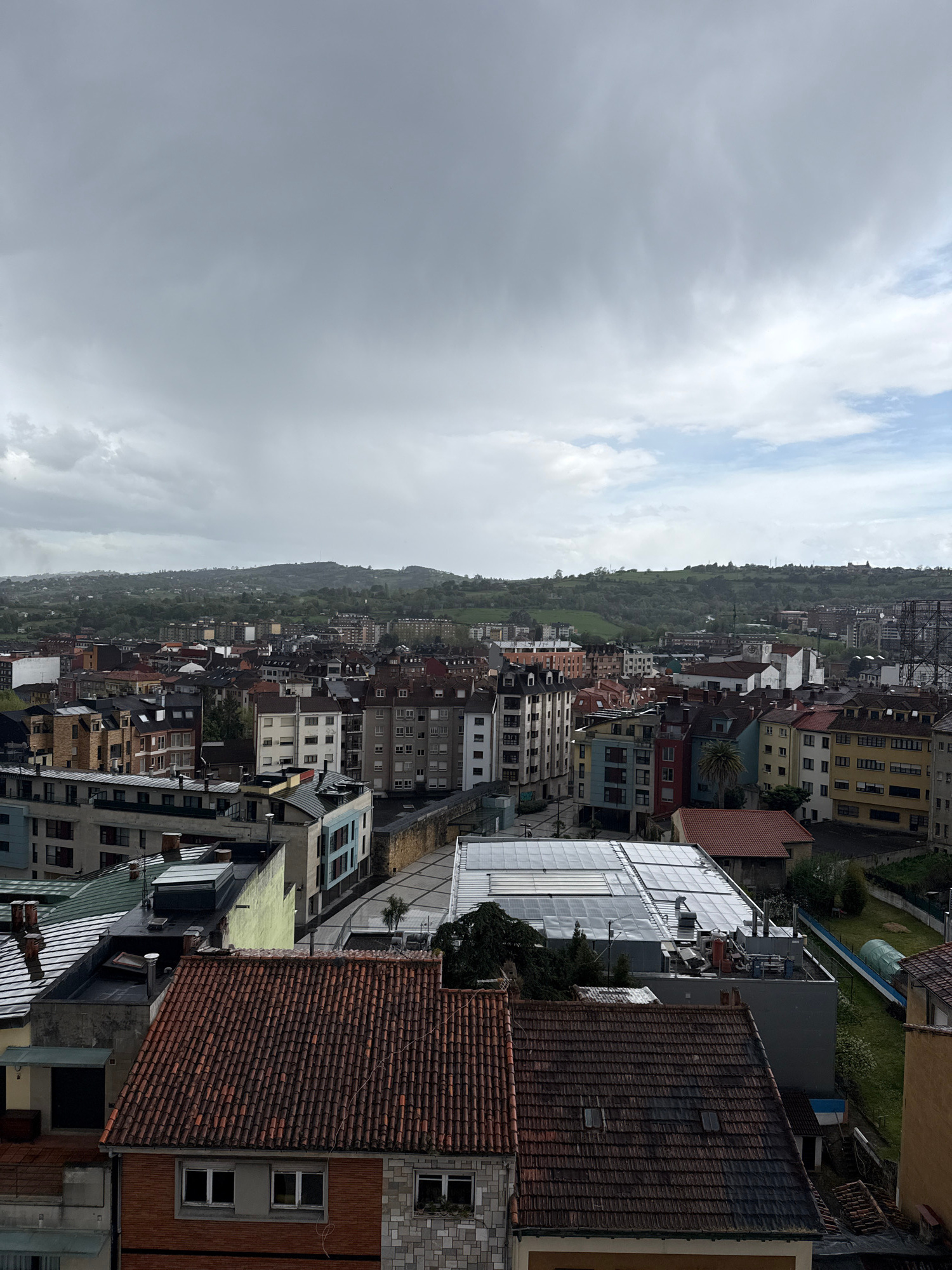 The image is a high-angle, slightly tilted, daytime shot of the city of Oviedo, also known as Uviéu, in Spain. The sky is overcast with mostly grey clouds. Below, a dense urban landscape is visible, f…read more