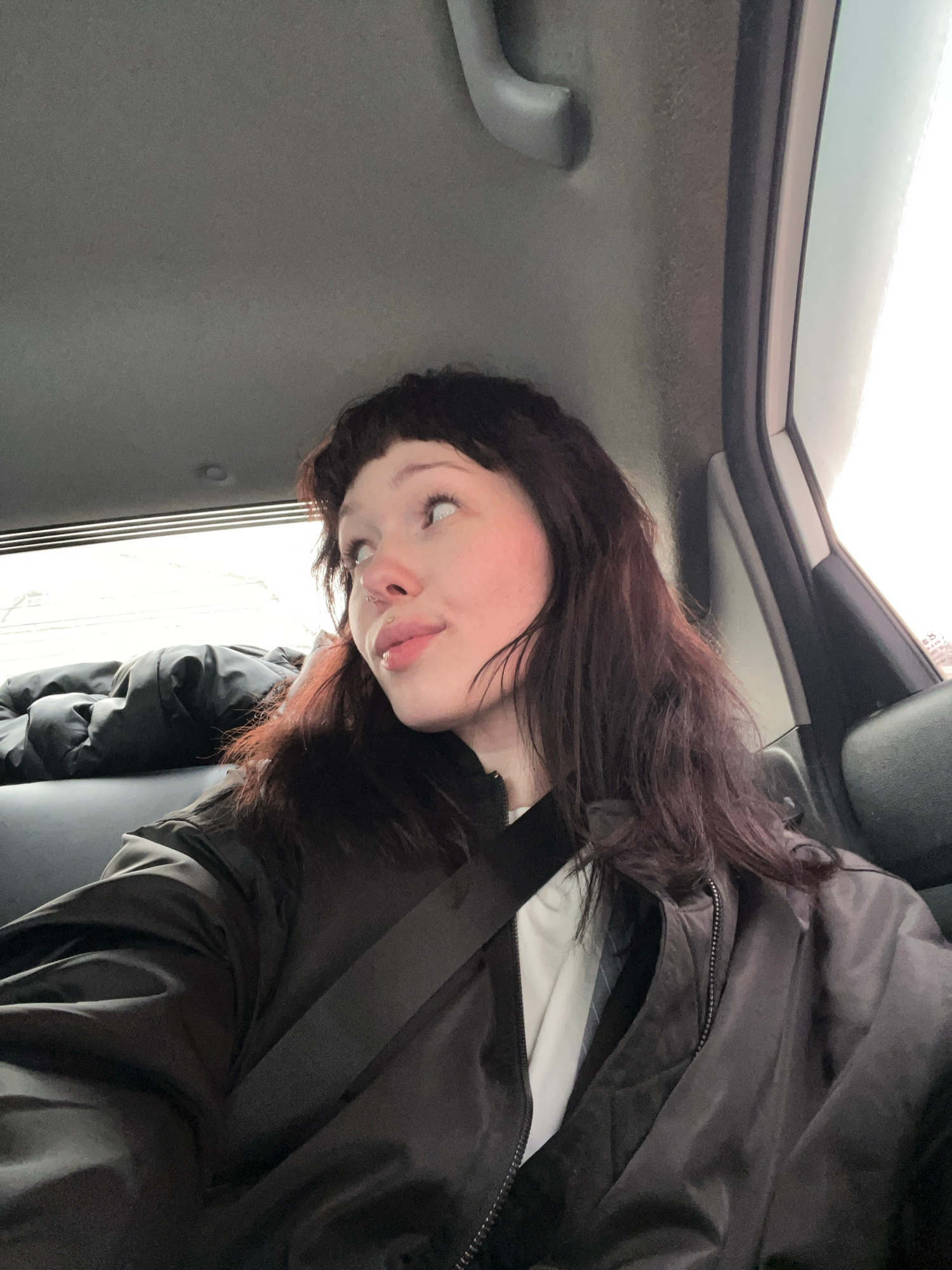 A person is seated in a car. They are wearing a dark jacket and a seatbelt is fastened across their chest. The car interior is grey. A window and part of the car's roof are visible. The person has dar…read more