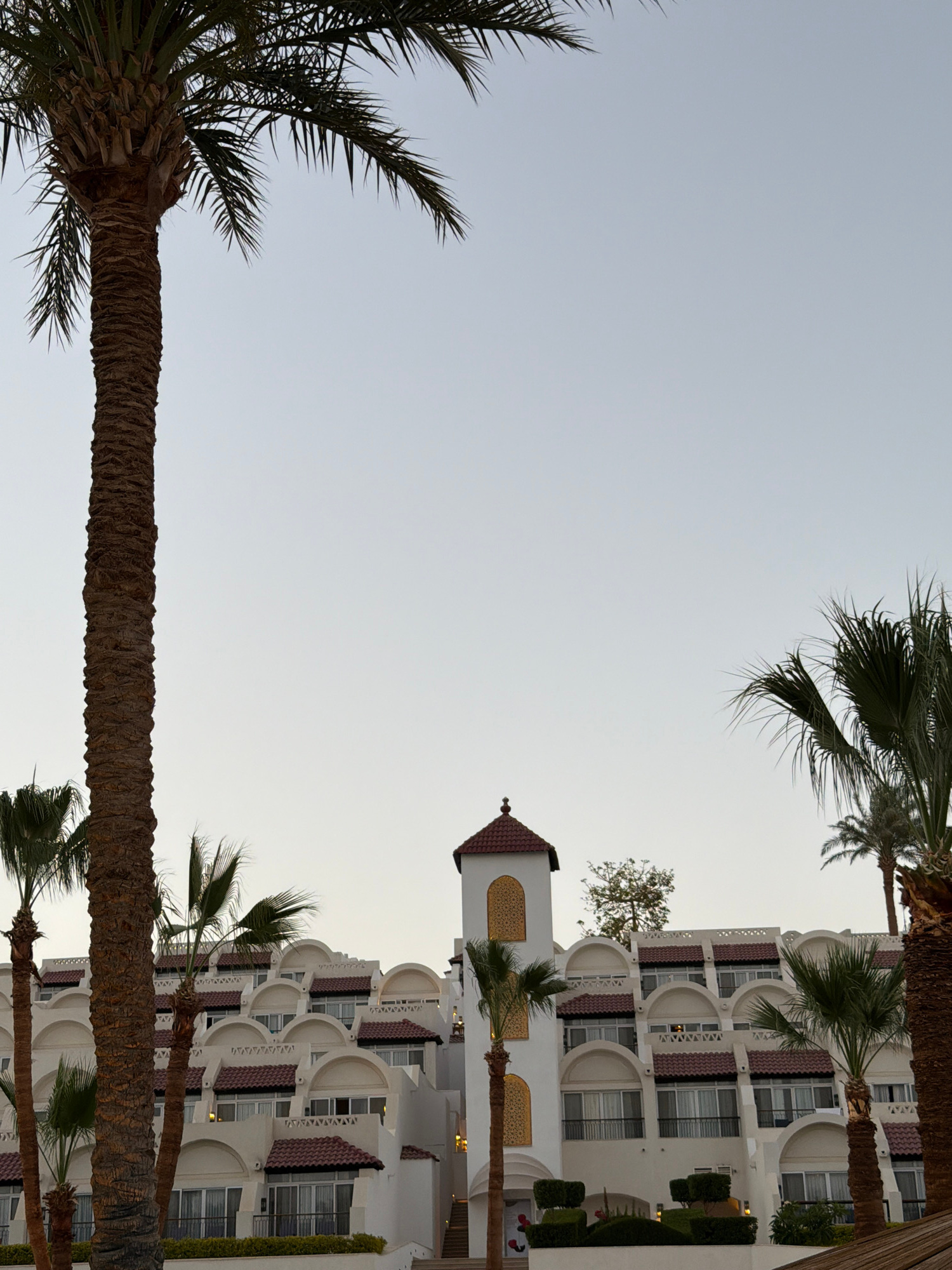 The image presents an upward view framed by palm trees, with a white building in the background. The building has an ornate design with arched windows and reddish-brown accents. A tower-like structure…read more
