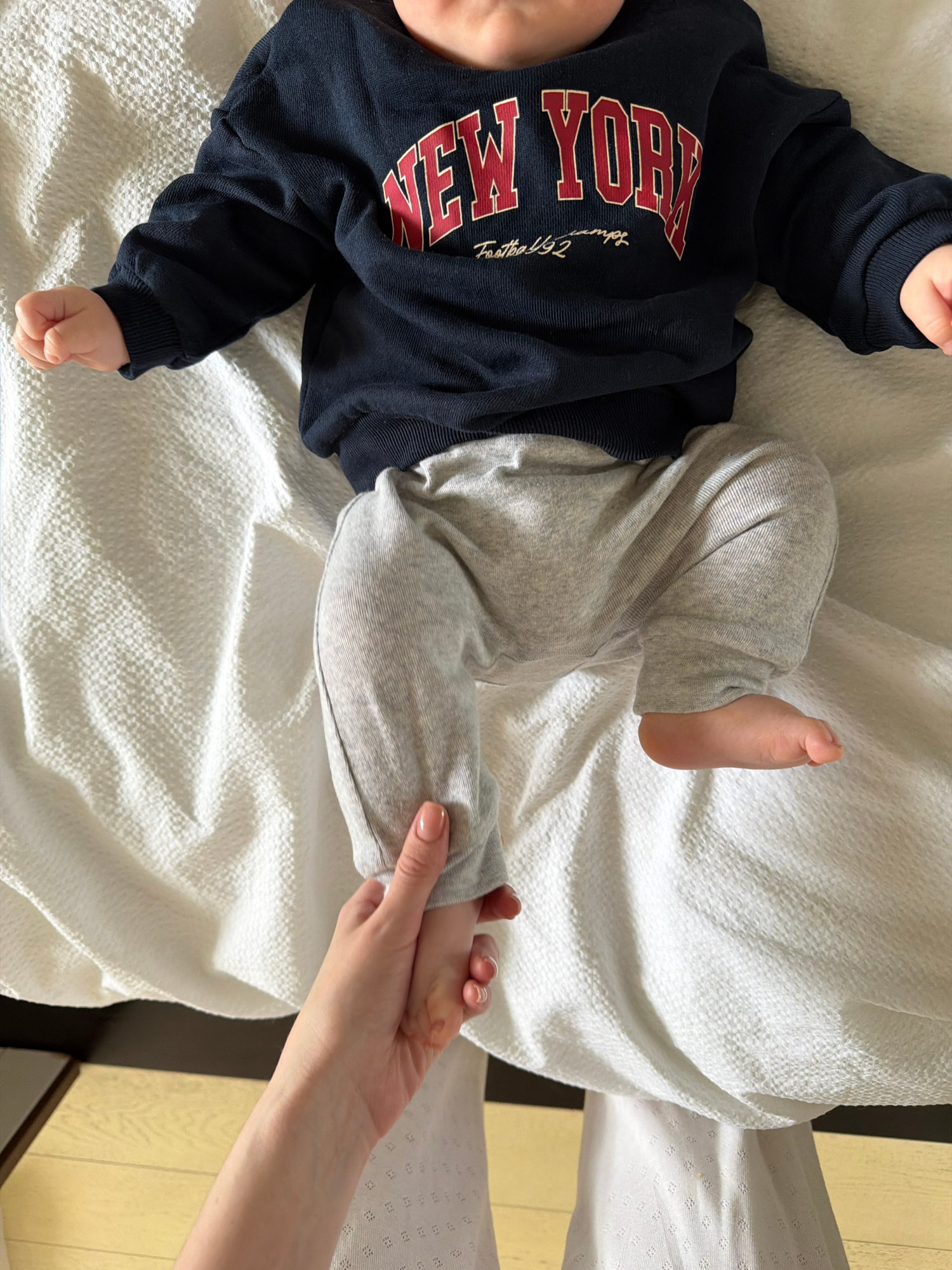 The image captures an overhead view of a baby lying on a white, textured blanket or bedding. The baby is dressed in a dark blue sweatshirt and light gray sweatpants. On the sweatshirt, the prominent t…read more