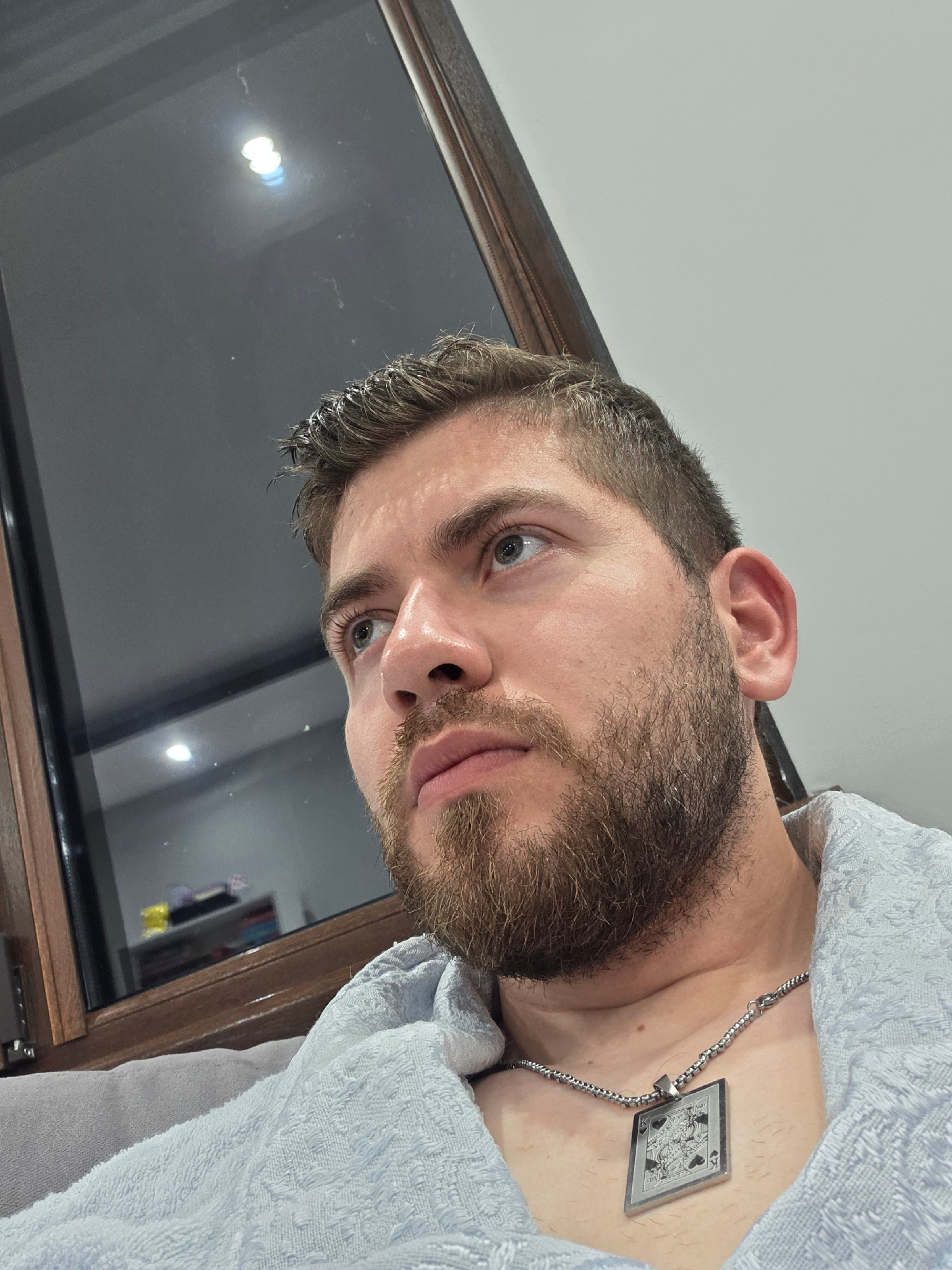 A close-up, slightly angled, medium shot features a man with a beard, fair skin, and short brown hair. He wears a silver chain necklace with a square pendant depicting a card suite, likely a spade or…read more