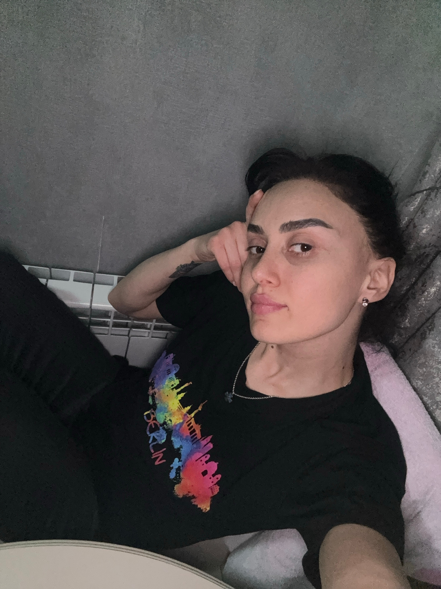 A person with dark hair pulled back is lying down on a grey surface next to a tile wall. They are wearing a black t-shirt with a colorful "Berlin" print and black pants. They have an earring in theirβ¦read more