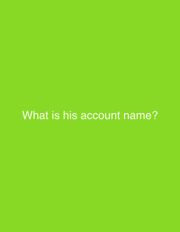 The image is a green background with the question "What is his account name?" written in white text.