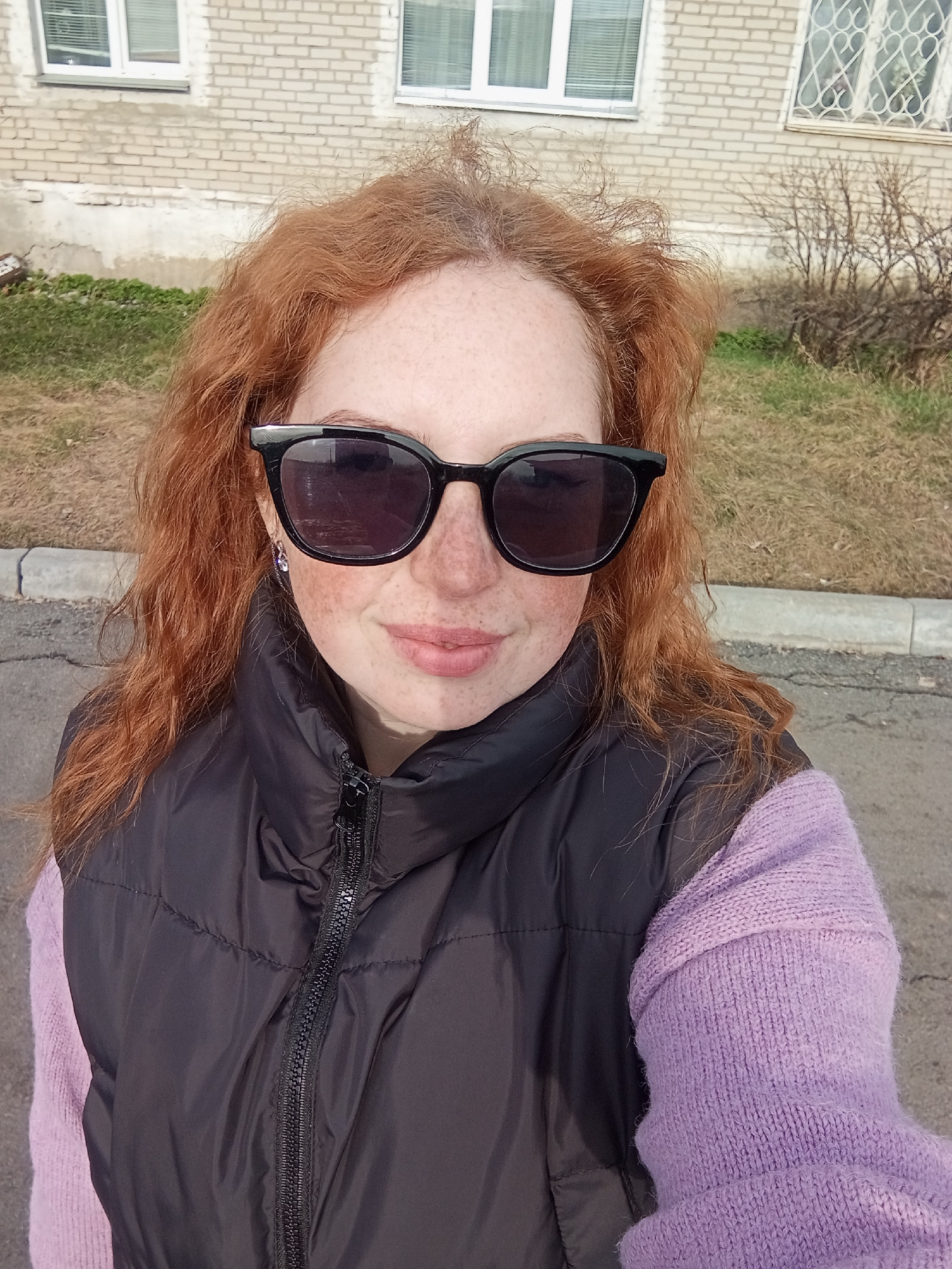 A woman with red hair and freckles is taking a selfie outdoors. She is wearing sunglasses, a black vest, and a lilac sweater. The background includes a brick building with windows, grass, and a sidewa…read more