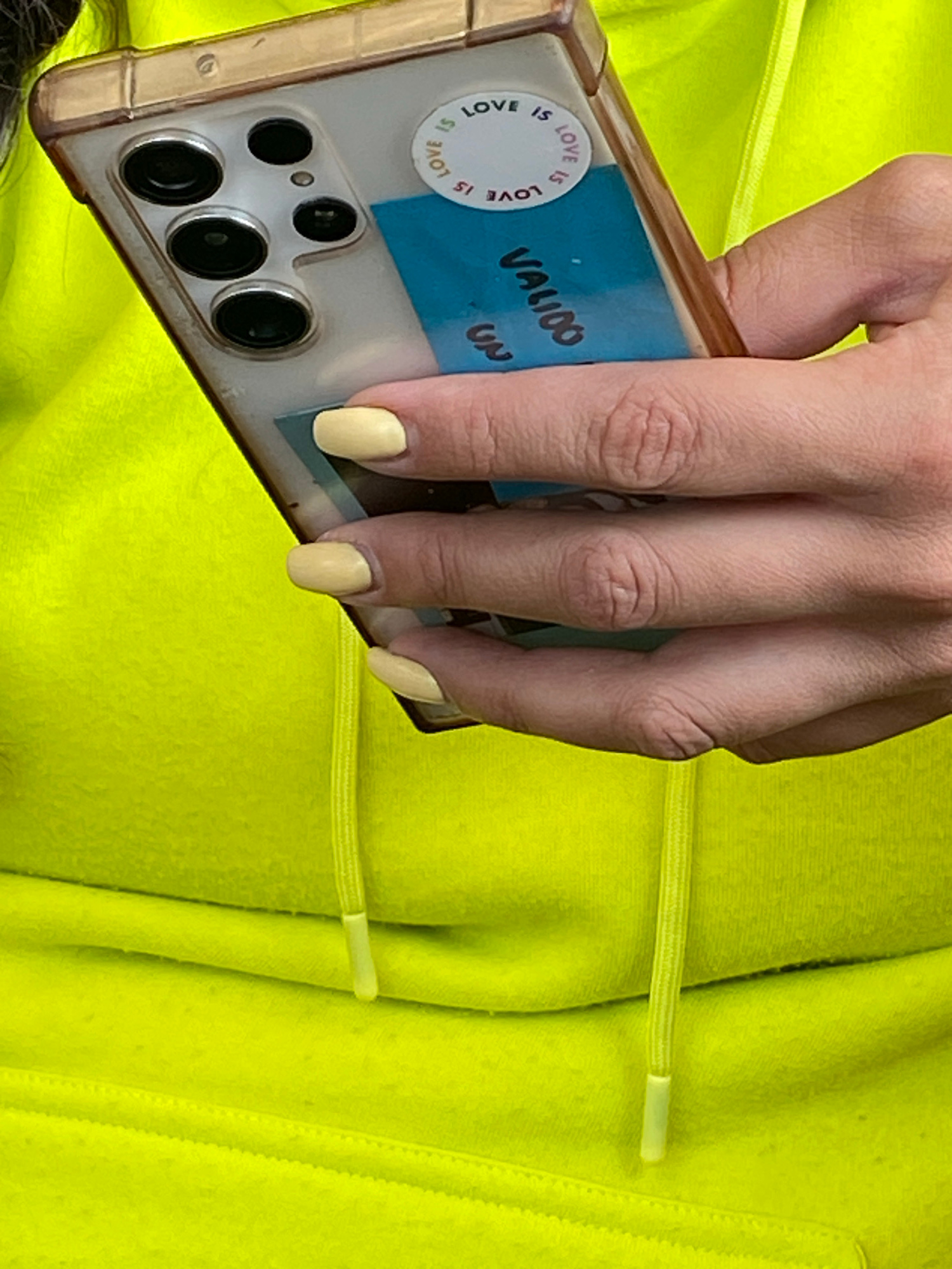 A person's hand holds a smartphone in a transparent case against a bright yellow garment, likely a hoodie. The smartphone case is decorated with two stickers: a circular one stating "LOVE IS LOVE" and…read more