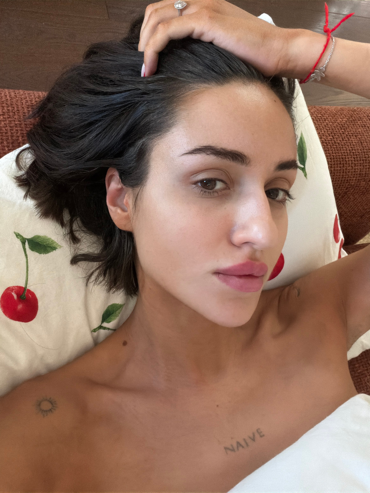 A female subject is depicted in a high-angle, close-up portrait, lying on her back and looking directly at the camera. Her dark, short hair is visible around her head, which rests on a white pillow pa…read more