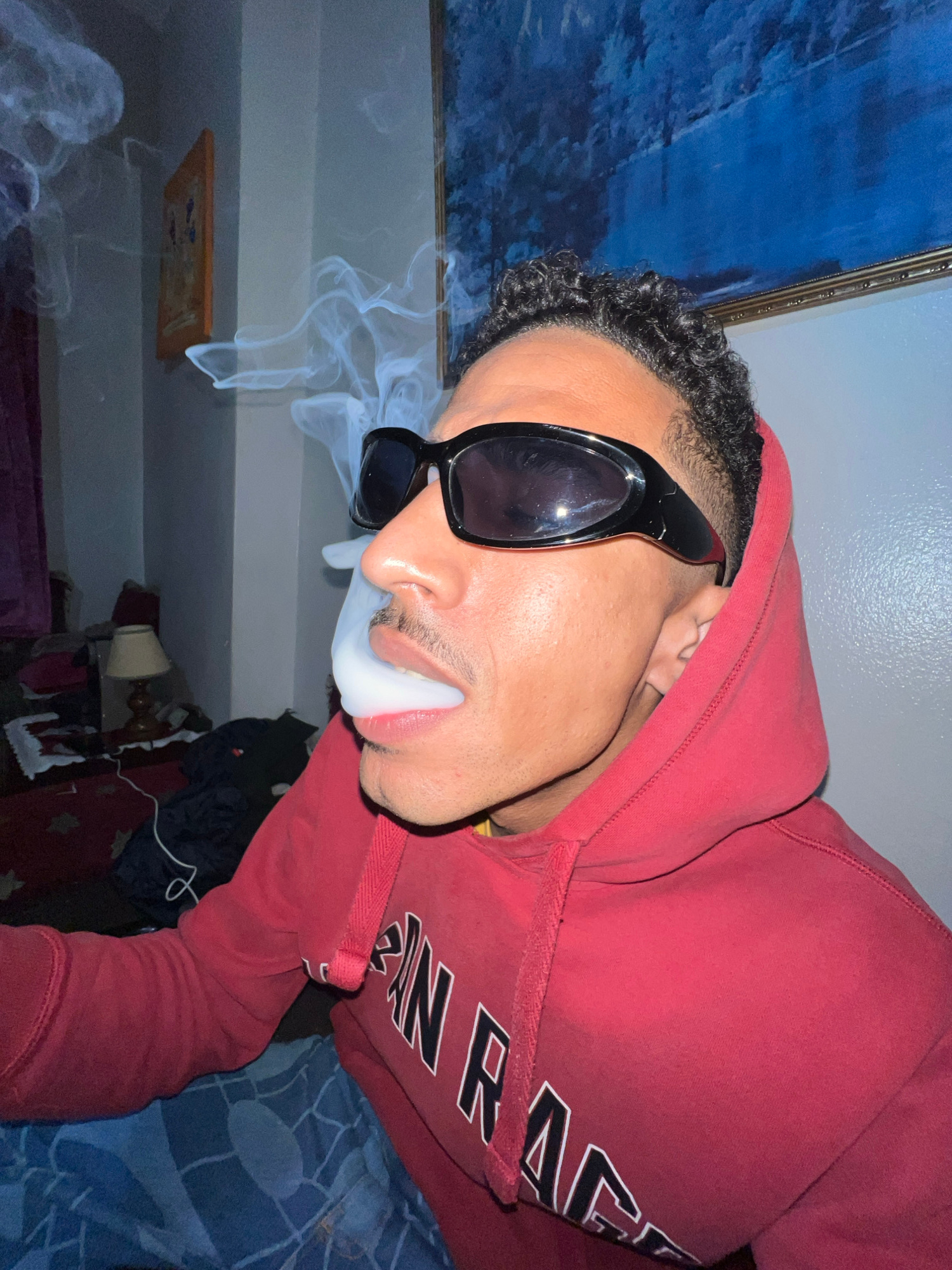 A man wearing a red hoodie and black sunglasses exhales a cloud of smoke. He is indoors, with a blue abstract painting and a smaller framed picture visible in the background. The environment appears d…read more