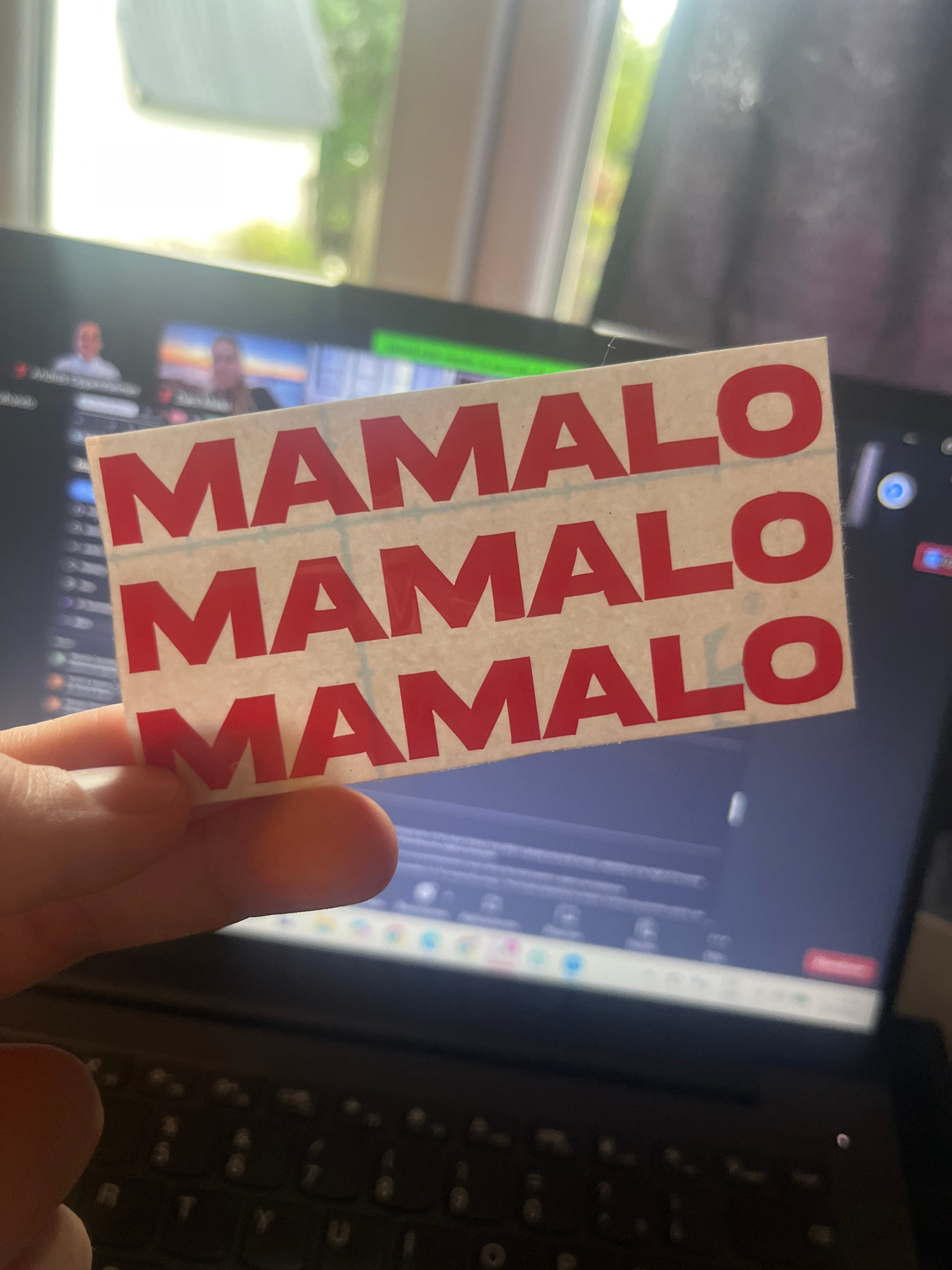 The image shows a person holding a sticker with the word "MAMALO" printed three times in red, block letters on a white background. The sticker is positioned in front of a laptop screen displaying what…read more