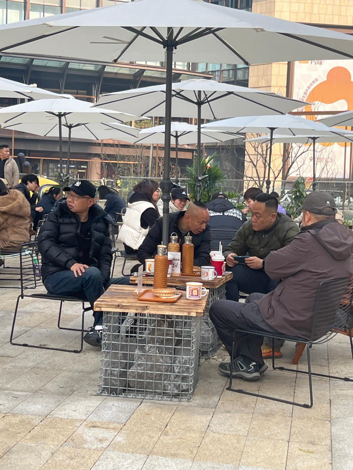 People gather at outdoor tables under white umbrellas. The tables, constructed with stone-filled metal cages as bases, display pastries and mugs. Several individuals are seated, while others stand nea…read more