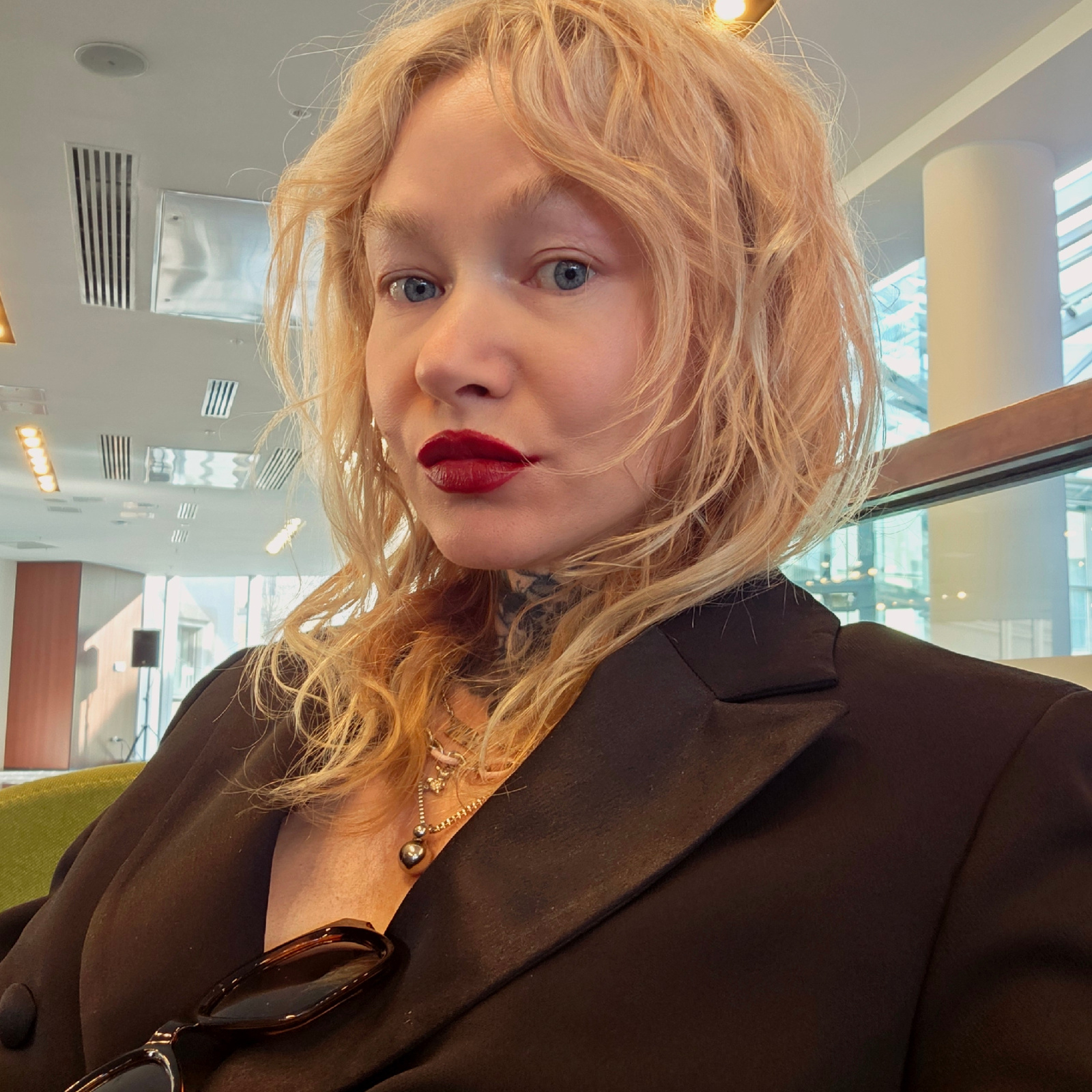 A woman with long, wavy blonde hair, striking blue eyes, and dark red lipstick is depicted in a close-up, slightly upward-angled selfie or portrait. She is wearing a dark, possibly black or very dark…read more