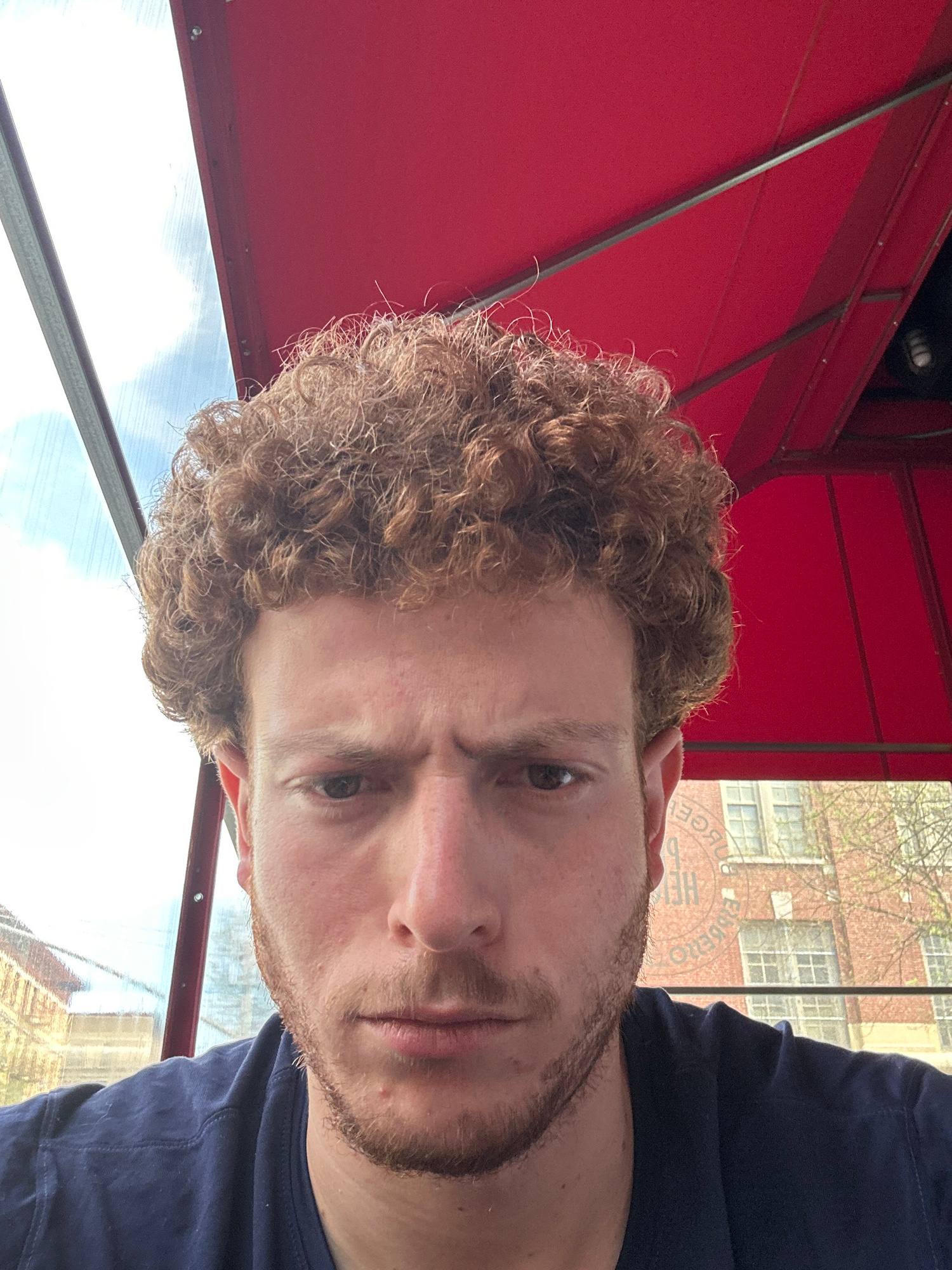 A young man is captured in a close-up portrait, oriented on his side with his head to the left of the frame. He has light skin, curly brown hair, and a neatly trimmed light brown beard and mustache. H…read more