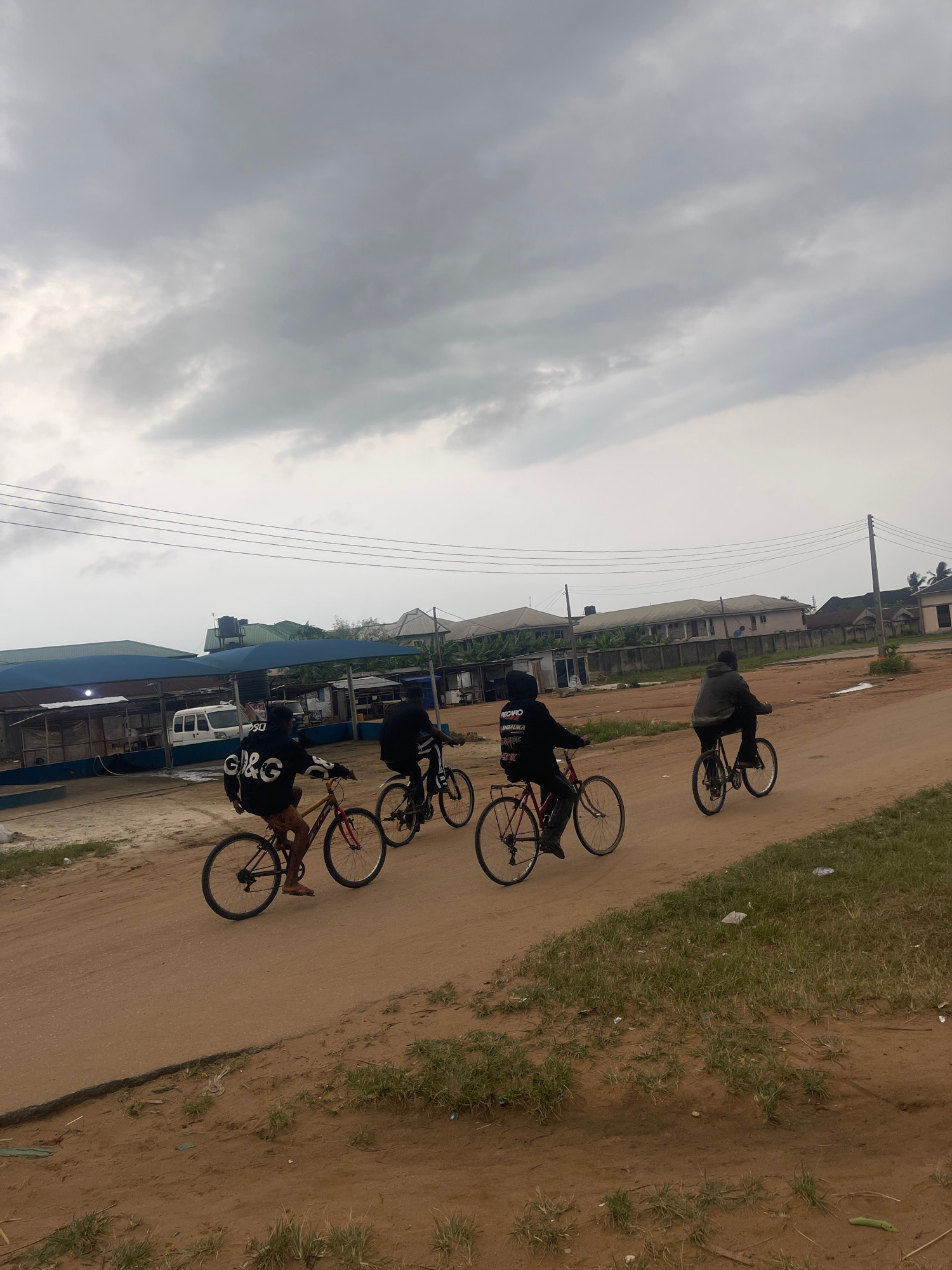 Four cyclists are seen riding bicycles on a dirt road in Abraka, Nigeria. The cyclists are wearing dark clothing. A building with a blue roof and a white van are visible on the left. There are houses…read more