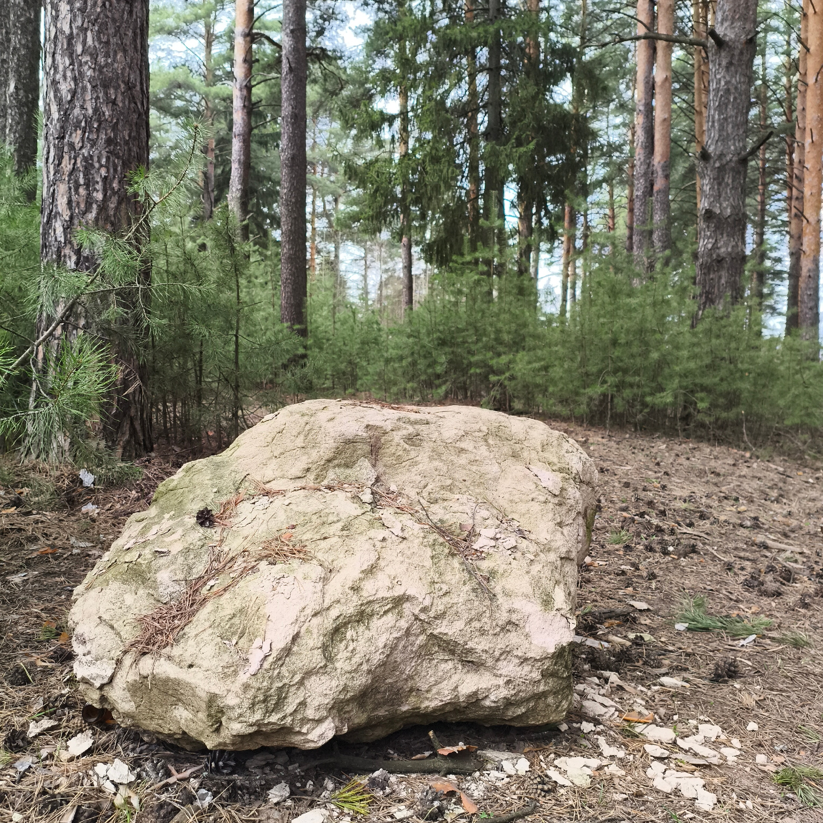 The image depicts a large, light-colored, roughly cuboid rock resting on the forest floor. The rock's surface is textured and marked with patches of discoloration and scattered pine needles. The groun…read more