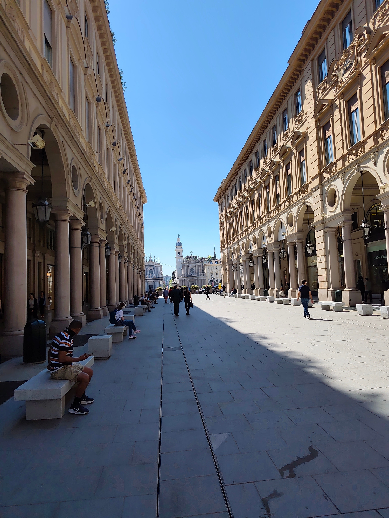 The image shows a long, straight pedestrian street lined with tall, ornate buildings on both sides. The buildings have arched walkways supported by columns, and the street is paved with stone tiles. T…read more